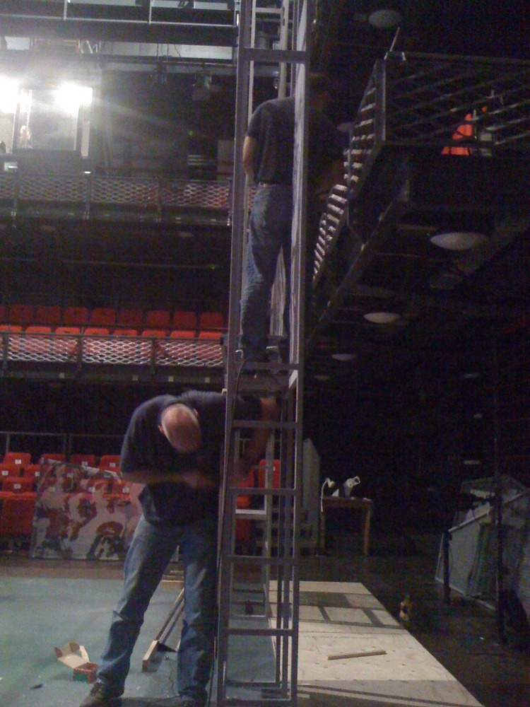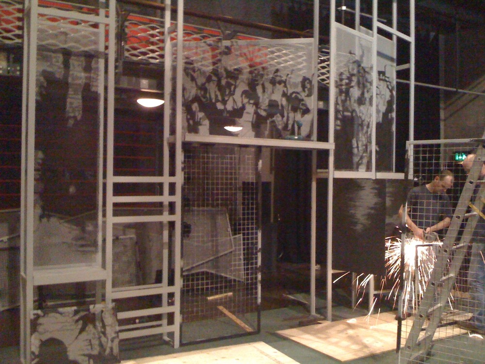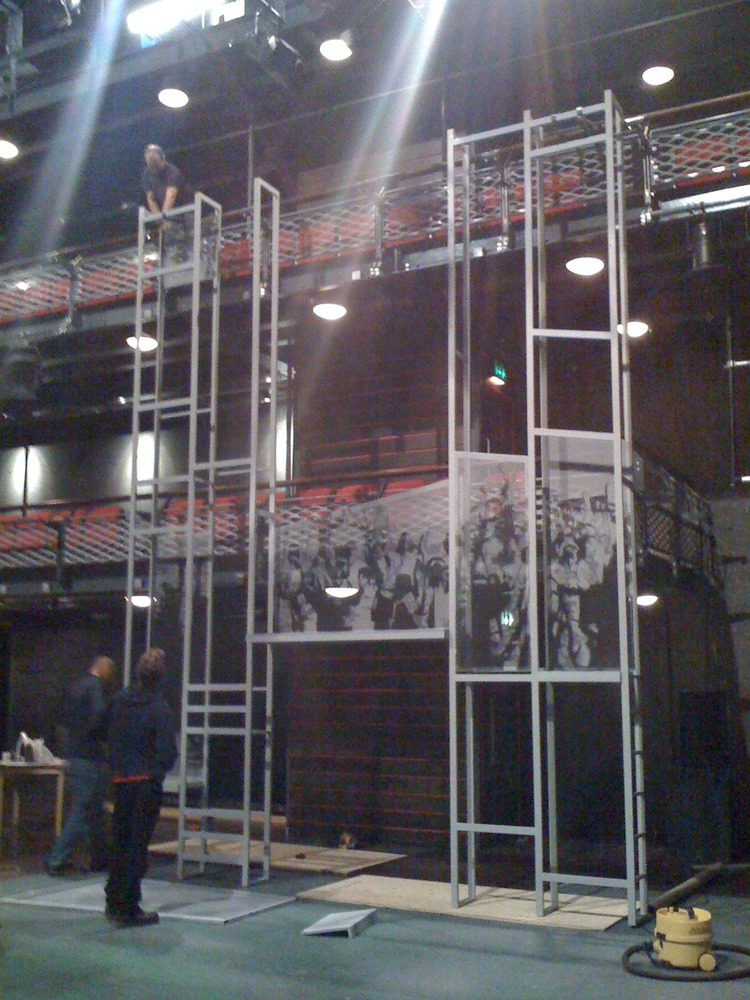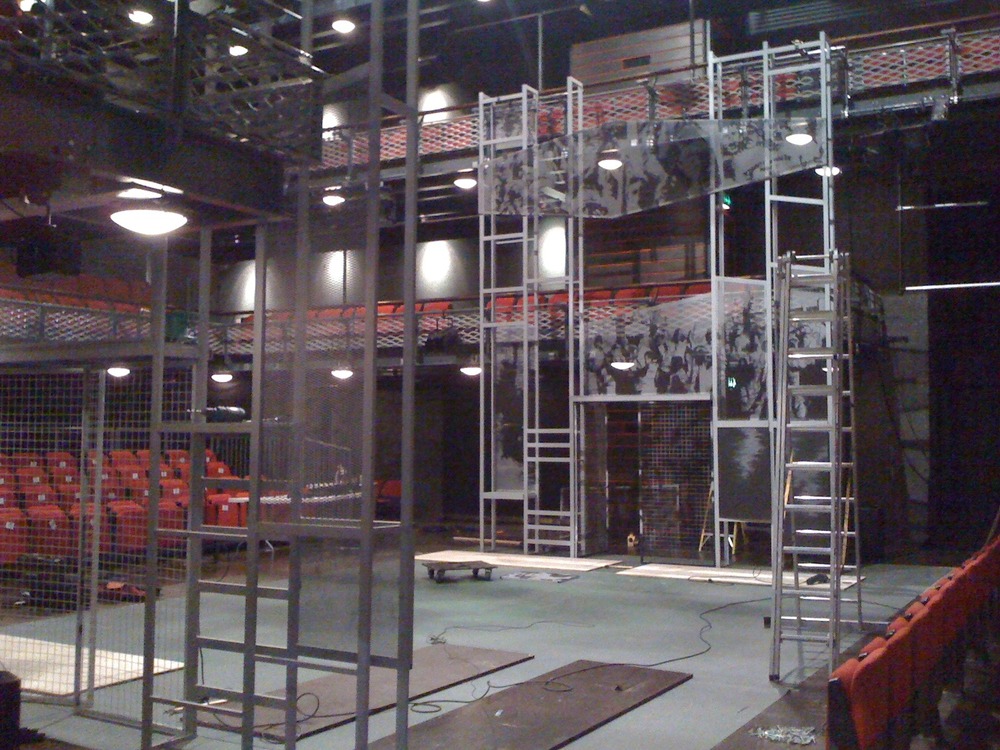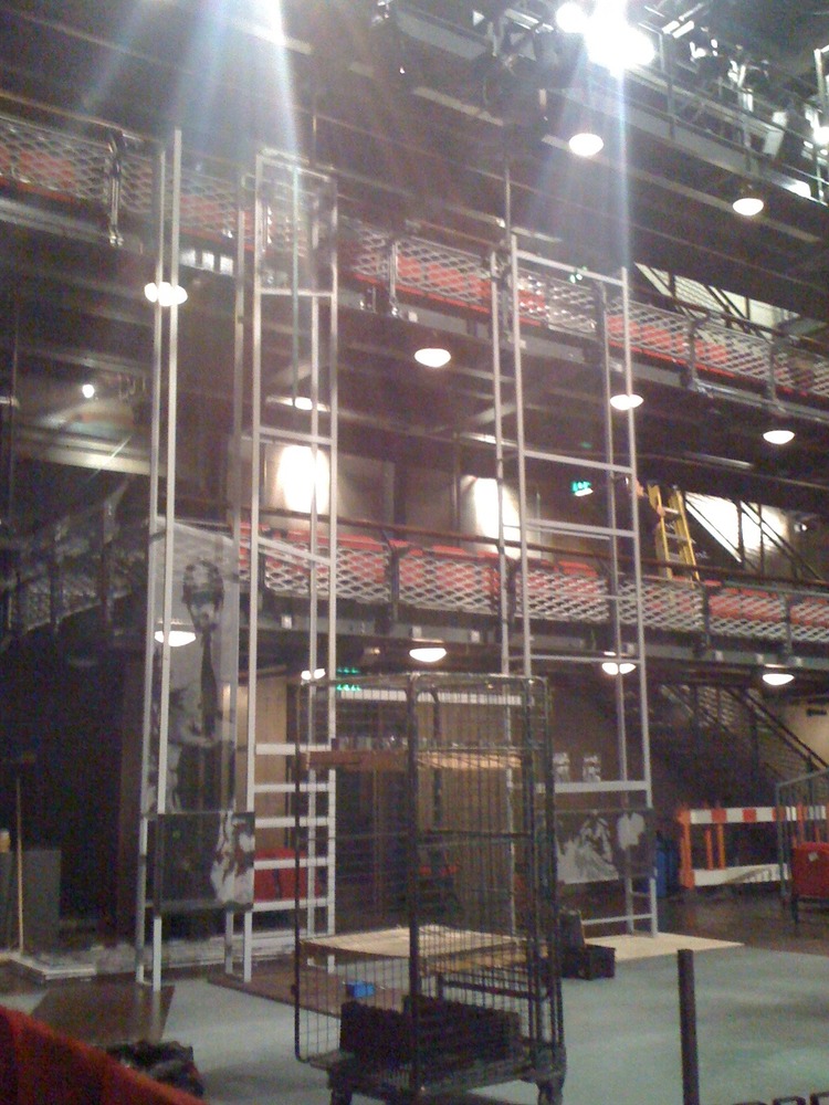 This is the first show in the Belgrade’s B2 auditorium to use the “short-traverse” set up. So first, the usual seating arrangement had to be struck and then the stage crew levelled the auditorium floor. Once that was done the set could come out of the van and into the theatre. Dancefloor down first, then steel frameworks into position, with only a few hiccups…Cast are due to rehearse onstage tomorrow and for the rest of the week, with lighting being rigged and focussed around them. Teching begins next Monday.