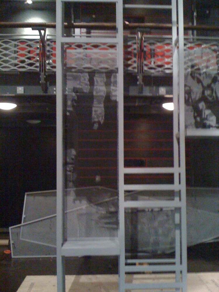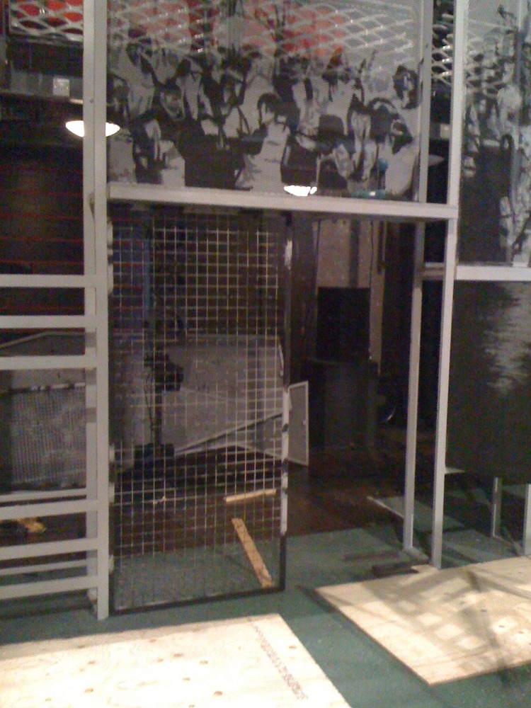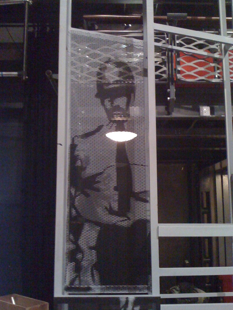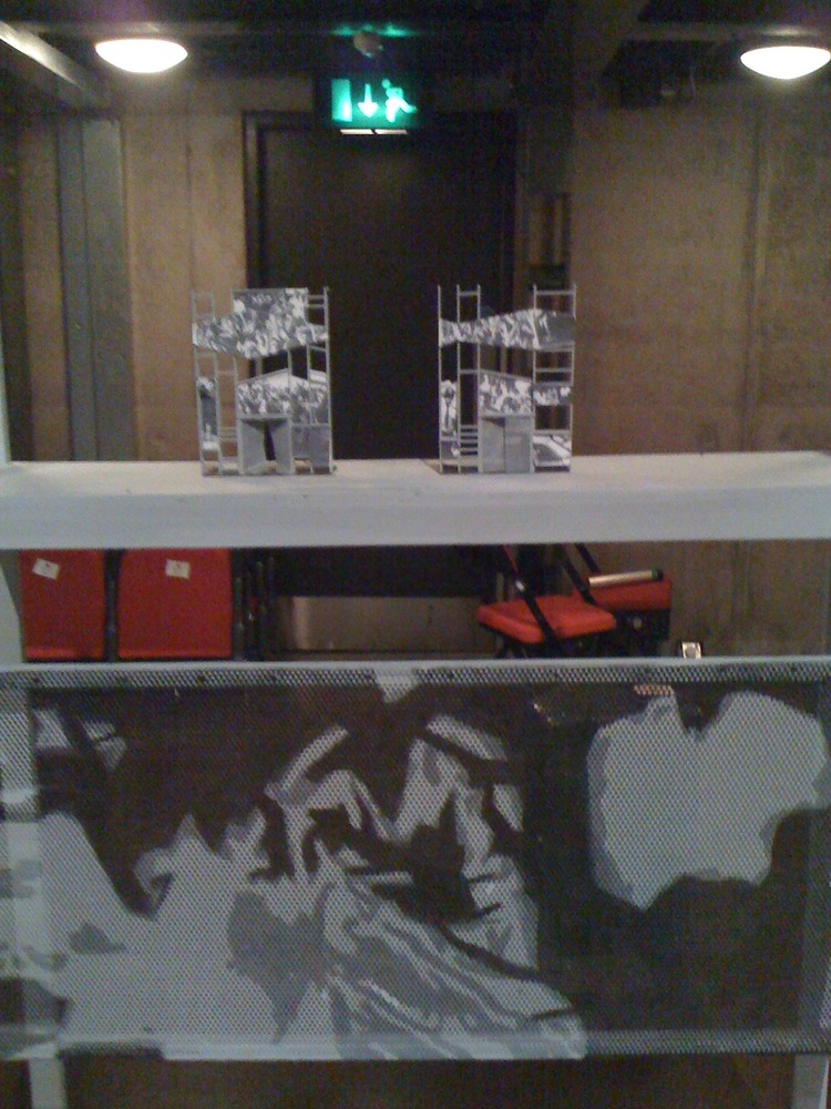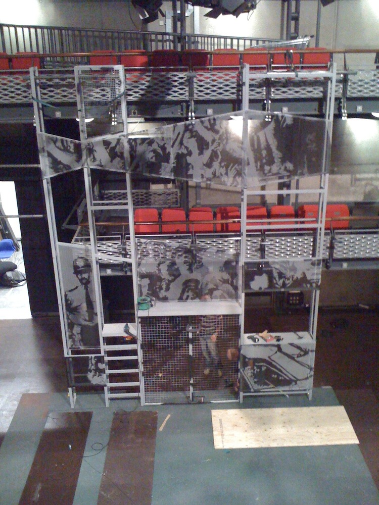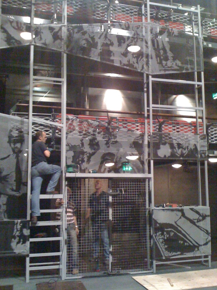This is the first show in the Belgrade’s B2 auditorium to use the “short-traverse” set up. So first, the usual seating arrangement had to be struck and then the stage crew levelled the auditorium floor. Once that was done the set could come out of the van and into the theatre. Dancefloor down first, then steel frameworks into position, with only a few hiccups…Cast are due to rehearse onstage tomorrow and for the rest of the week, with lighting being rigged and focussed around them. Teching begins next Monday.