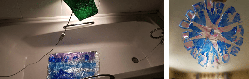Initially I had aimed to show reflections of the canal on iconic structures in Coventry (and I still might) in hopes of commenting on how, as ‘the body’ of Coventry, we view the city. I then came up with the idea of drawing iconic landmarks and statues of Coventry on cling film as I’d seen a lot of its scrunched presence surrounding the waters. I took a liking to the transparency of it but when I tested the sketches in the water, I realized that it was mainly the base of my tub that was bringing out these images. The practicality of it became unfeasible at this stage because one wouldn’t be able to see the projected images.