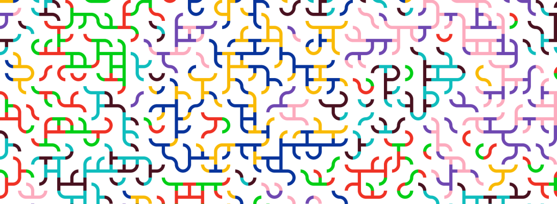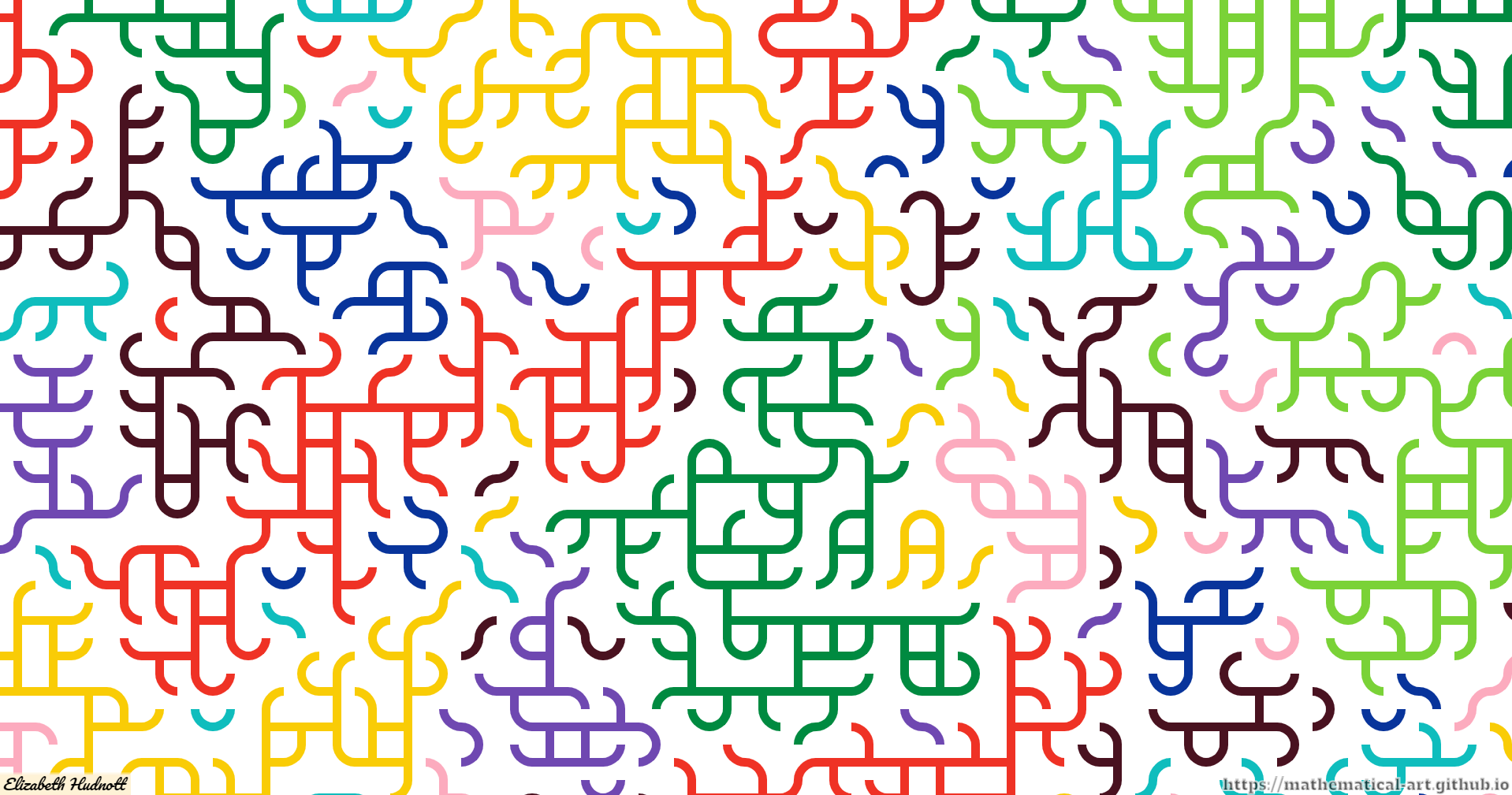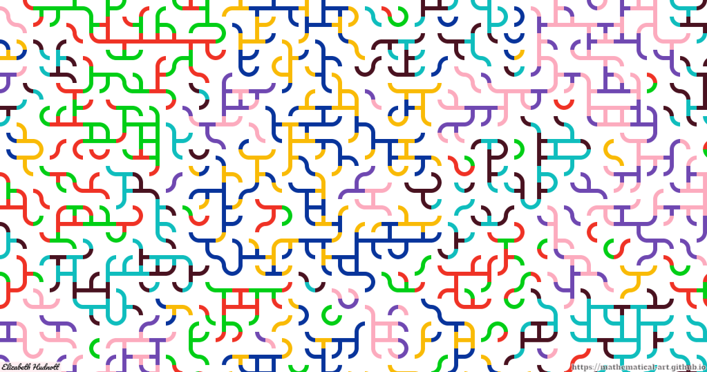 Prior to this project I discovered it’s often a bad idea to create parameters with discrete options because they produce sharp transitions during animation, which sounds like an obvious thing but the reality is more nuanced than that. Moreover, I discovered a discipline of reimagining things that I initially thought of as discrete parameters as continua instead. This discipline led to the conception and subsequent implementation of a parameter that controls the probability of colour flow. When set to 1 then colours always flow from tile to tile. When set to 0 a new colour is always selected when a line crosses a tile boundary, which looks similar to but differs in construction from the “As Designed” mode. Then the feedback process from idea to thought to code to visualization and back to a new idea led to a refinement of this flow / no‑flow concept. Rather than selecting any new colour from the palette when a no-flow situation occurs, I instead decided to organize the colours into groups so that a yellow line can change into a blue line but not into a green line, for instance, because green is grouped with red. This involved another new parameter to decide how many colours should be in each group. I find the final result quite pleasing.