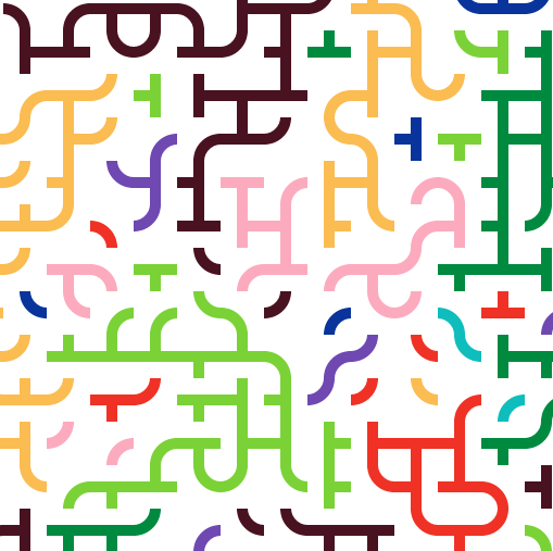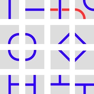 Introducing colour flows had started giving my images some form. But there were often instances where a tile didn’t connect with any adjacent tiles. For example, these could be curved pieces that didn’t connect to anything at either of their two ends. I named these tiles “wispy bits”. I wanted a way of ensuring each tile looked like it had a purpose, so I devised a plan whereby I would be able to configure a minimum number of connections for each type of tile. This allows me to express, for instance, that a straight piece or a curved piece should be connected to something at least one of its two ends or that a T-junction should be connected at least two of its three points.