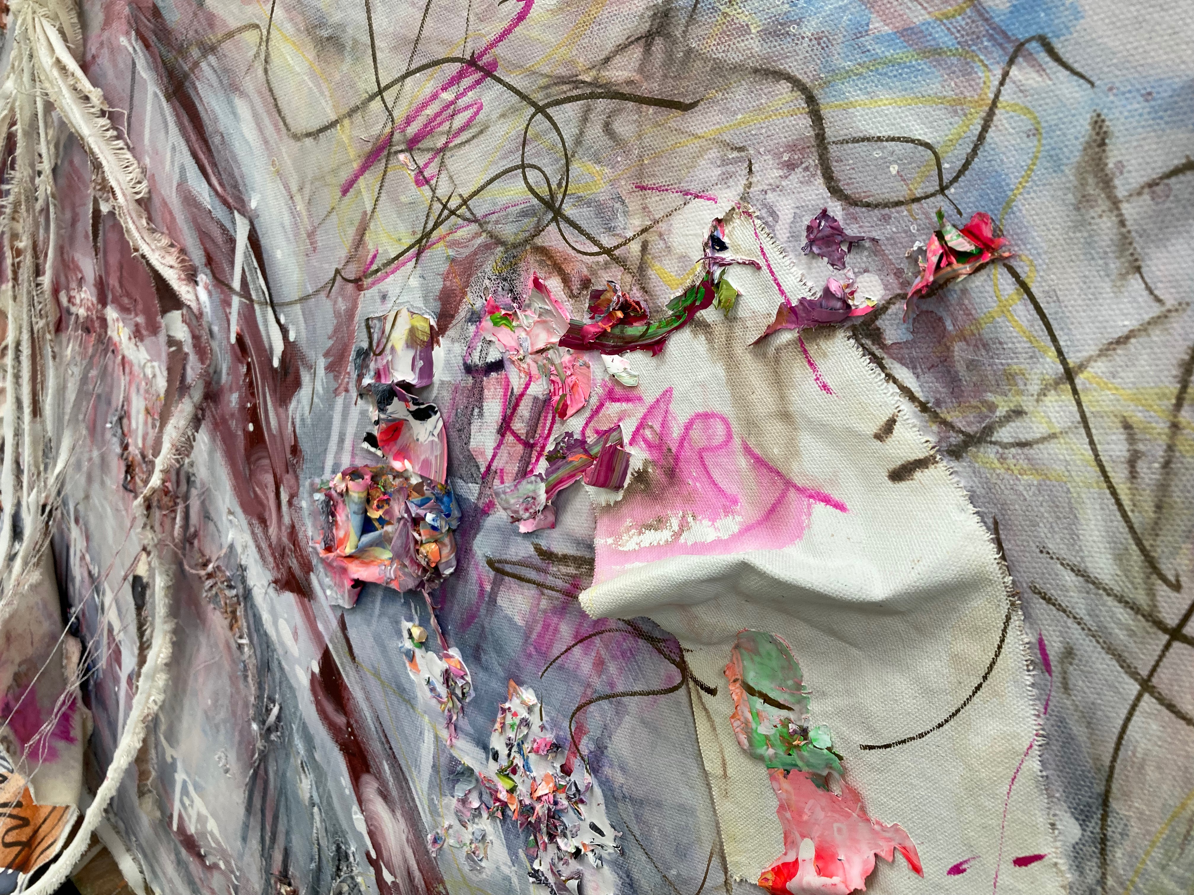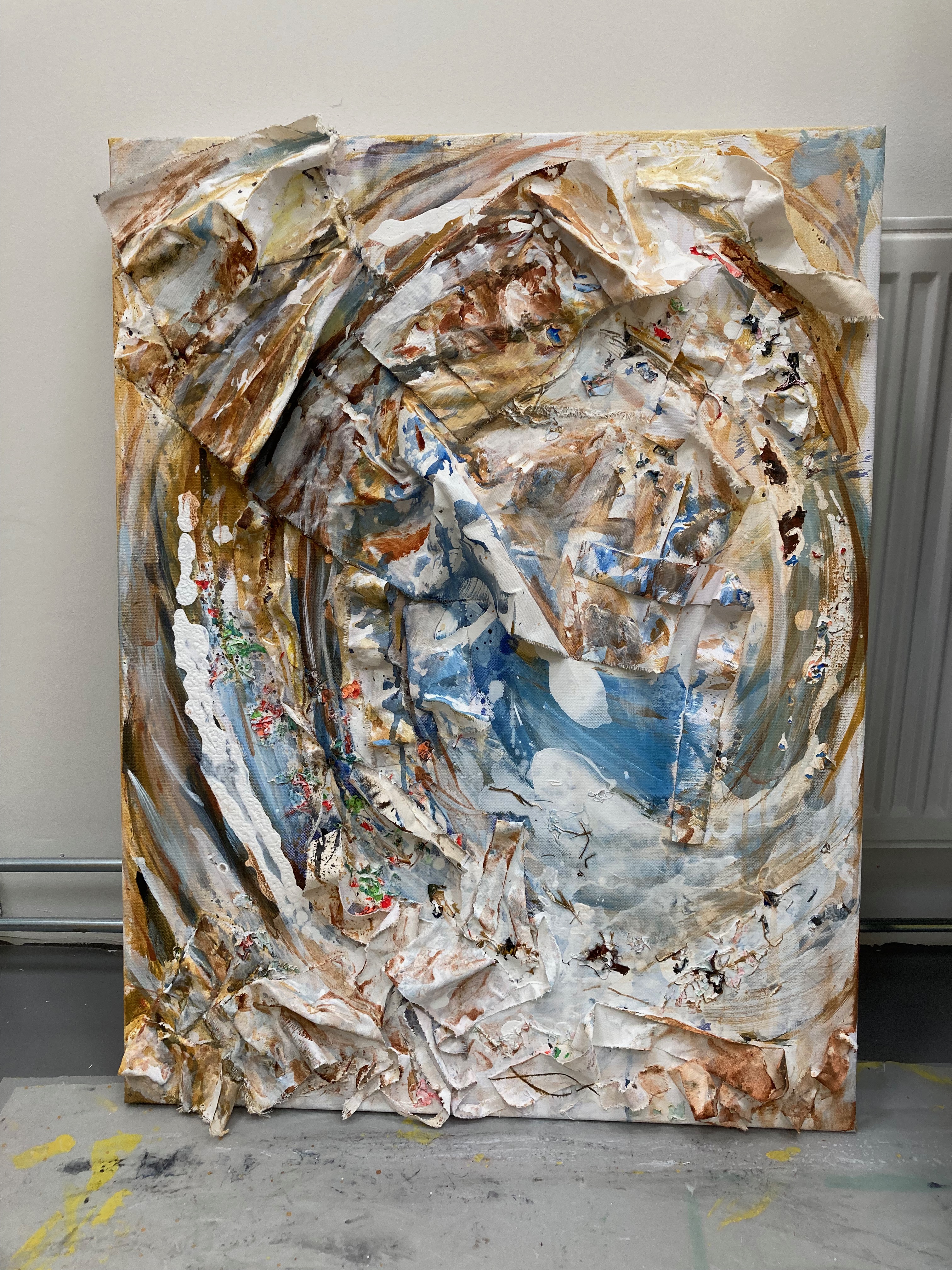 As a result I craved time and space to really play with those ideas free from the usual financial restraints that come with maintaining an artistic practice that is still developing. I applied for a Nest residency proposing to experiment with recycling painting waste into new works and using these textures to really explore mark making and layering. Talking Birds were kind enough to provide me some time, space and conversation.