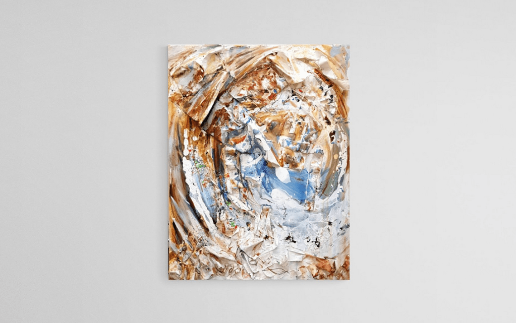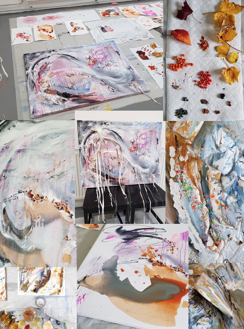 I was finding a lot of peace and therapeutic benefits in nature bathing and beginning to form loose notions of taking natural pigments found during such moments in nature, as sort of talismans, and using them to process some of the emotions I’m trying to put on canvas. Alongside this I was becoming increasingly concerned by the sustainability of my painting process and began to toy with incorporating waste such as canvas offcuts and old paint scrapings from my palette into textures on new works.
