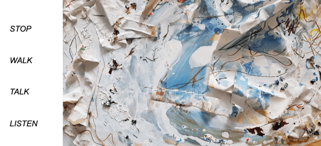 I found some cool new ways to make use of canvas offcuts and old dried paint that would otherwise go to waste. I had some great conversations with my peers about inviting others to explore non-verbal and diverse communication in publicly engaged performances. But I found that those activities just facilitated the real lesson, which was in being able to come to my practice from a place of experimentation and play, responding to changes as they occur, organic improvisation, a willingness and readiness to fail, and deal with the sensations should that happen.