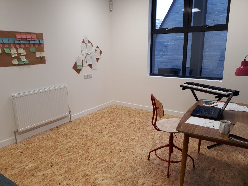 The residency was definitely a first for me – I’ve never experienced anything quite like it. For so long, I’ve been used to working on creative projects in between the things I’m supposed to be doing – keeping these things I enjoy contained within moments of procrastination or snatched seconds of free time. And so, to have my own dedicated space – and a lovely one, at that – where I was not only allowed to work on this project the whole time, but in fact that was what I was specifically there to do…it was almost overwhelming! I was extremely worried I was going to end up floundering or hitting a brick wall, and ending up wasting the whole two weeks. For my very first day, I came up with a plan to try and stave this off – I was going to map out the entire musical, on the wall, with post-it notes. If I was going to have access to a blank wall that was big enough, then I was going to use it! But it was also something visual and practical, which meant that I could step back and see the bigger picture and spot the gaps that needed to be filled. This ended up being incredibly helpful for letting the project solidify into something tangible – because suddenly this wasn’t just something in my head. It was something I could see and touch. That other people could see and touch.