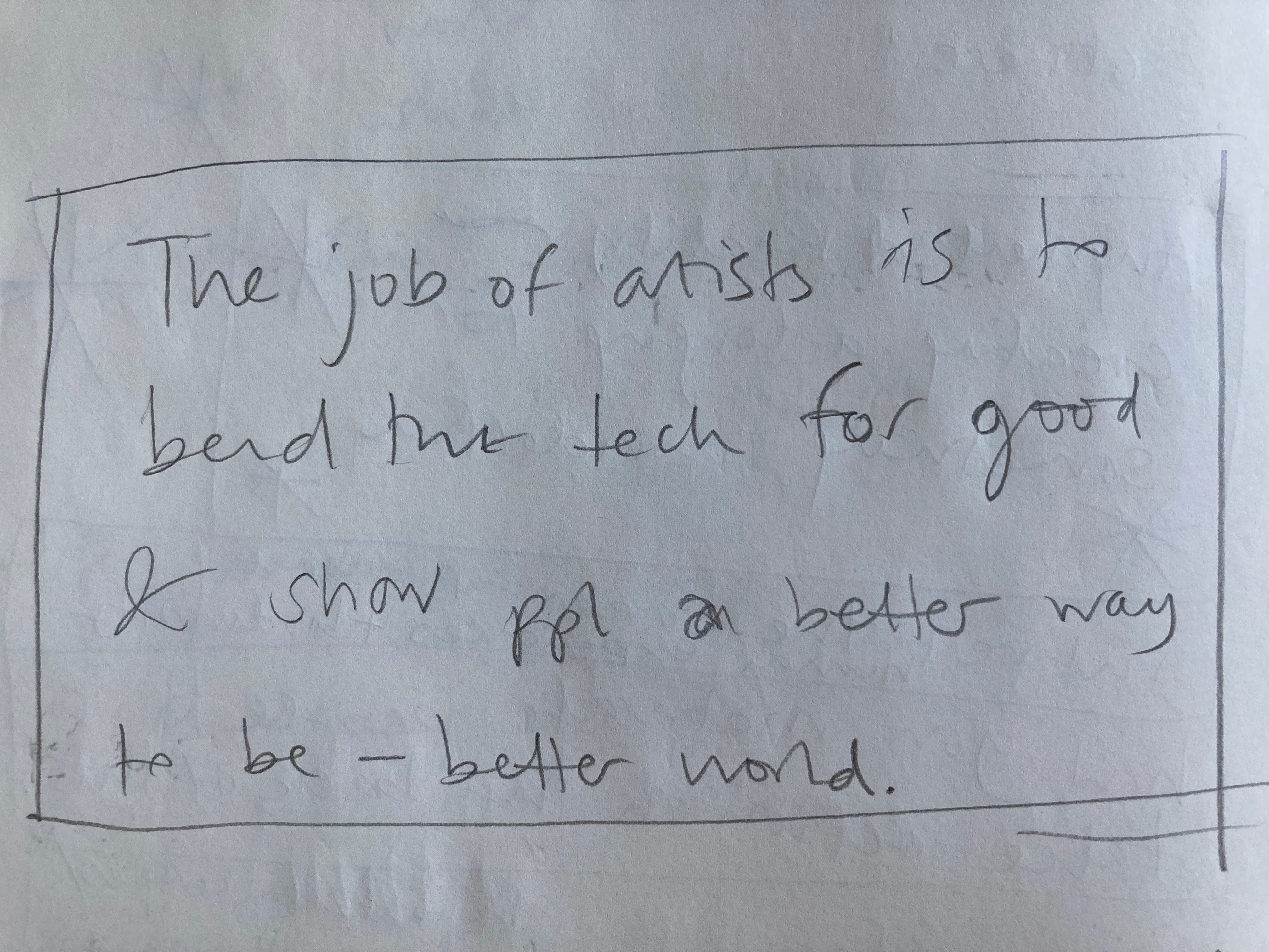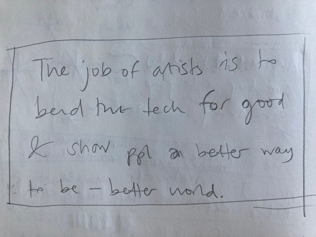 After the project design sprint, we now have ideas that are beginning to shape up. There is some synergy with our Citizens’ Assembly project, Art for the People, our interest in social democracy and in taking, and inspiring, action against the climate emergency. Can we pull something together from all of these strands that stays true to our values and has a fighting chance of ‘bend[ing] the tech for good and show[ing] people [there might be] a better way to be – [to collectively make a] better world’?
