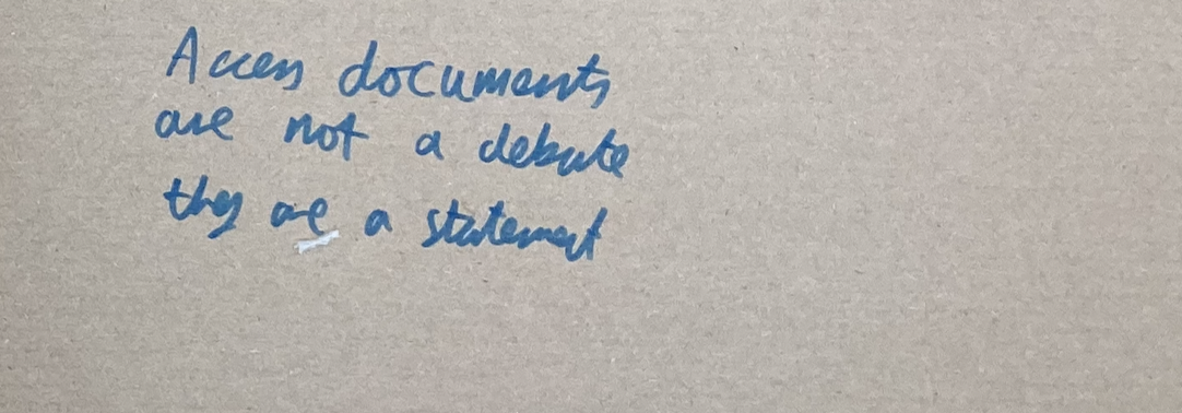 The process began by looking at the purpose of access riders as tools to communicate the needs of individuals who face harms within society that are often unaddressed in professional relationships. Throughout the week, the focus shifted towards an additional focus on what B.O.O.K working group member melissandre varin coined the “conditions of creation”.