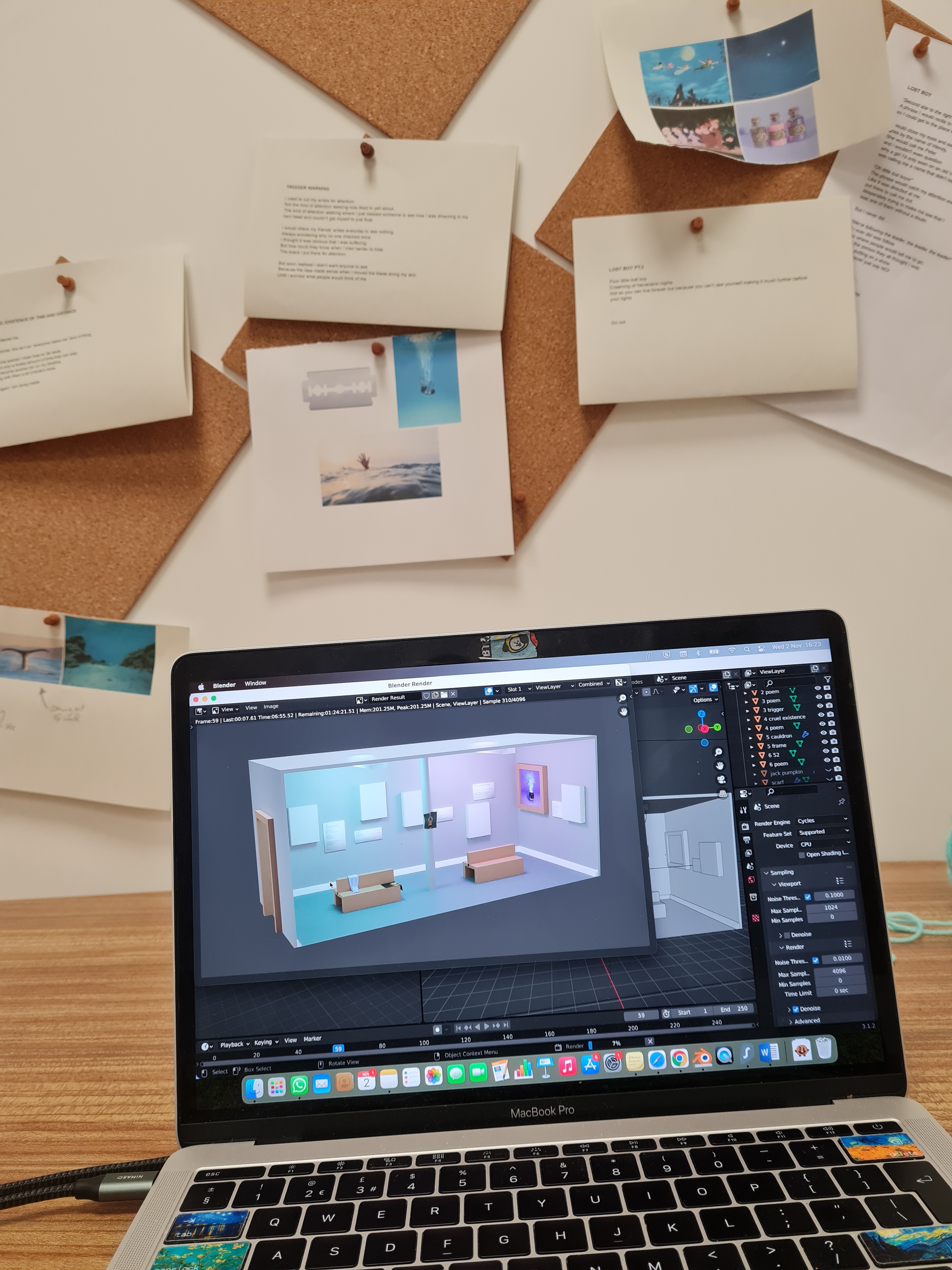 I went in with the messiest mix of ideas that I so desperately wanted to all come together, and my time in the Solid Blue studio helped me do just that. I knew that I wanted to mix media and develop some skills that I was not the most confident in. I ended up creating a 3D digital art gallery to display multiple poems of mine, along with a piece of art to go with each one. I have always wanted to share my poetry but always felt very self-conscious and didn’t want to just