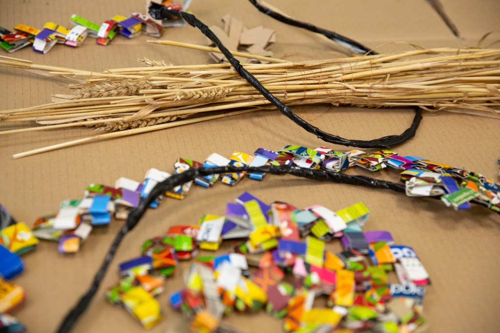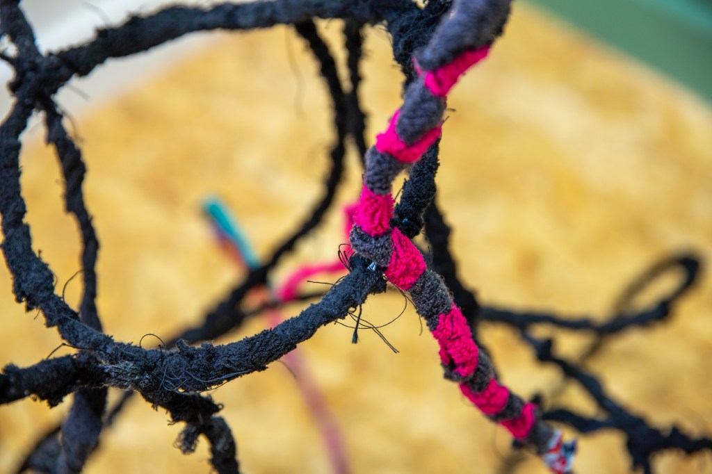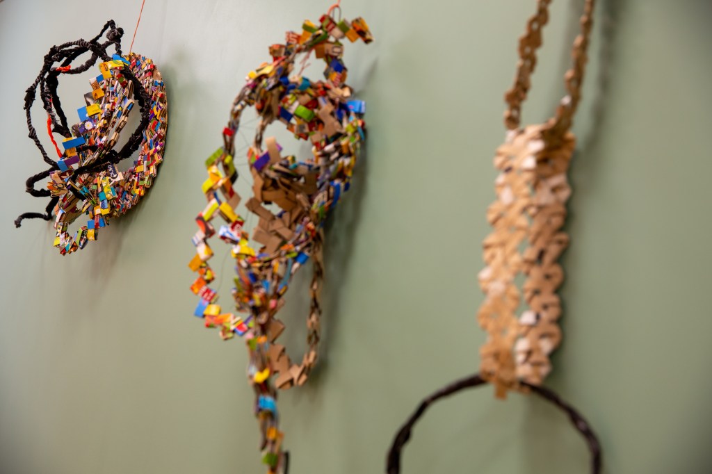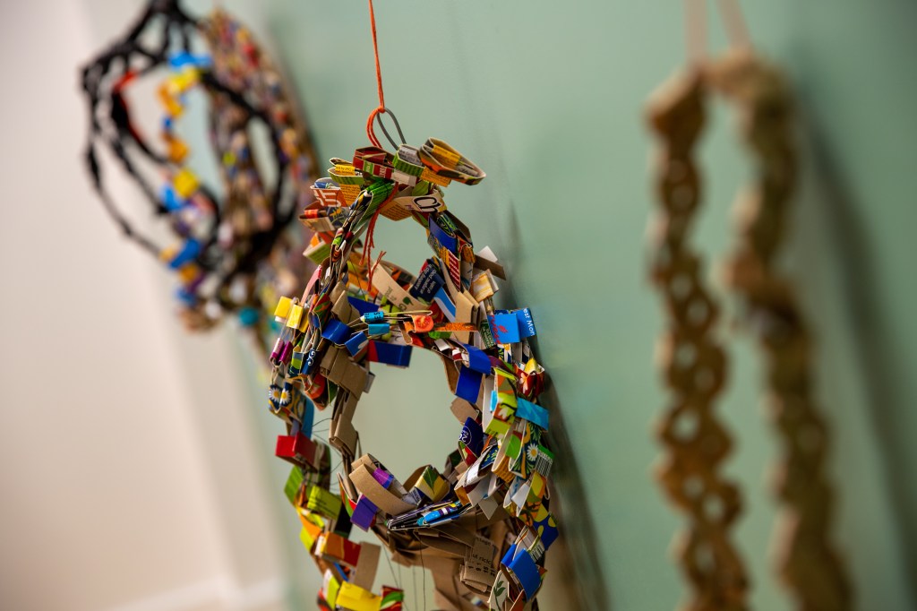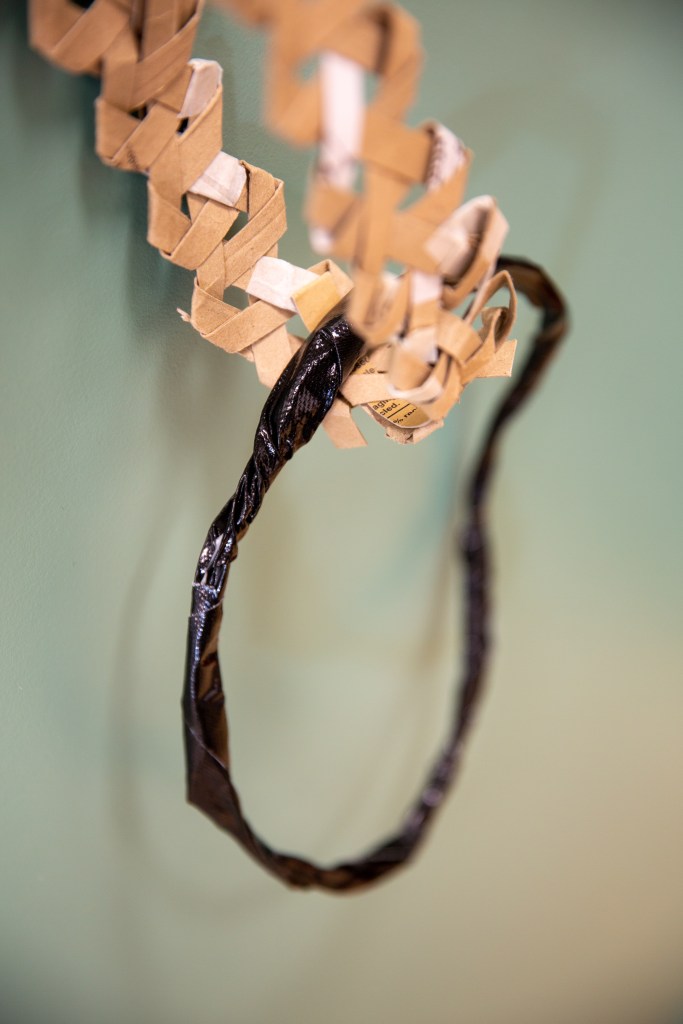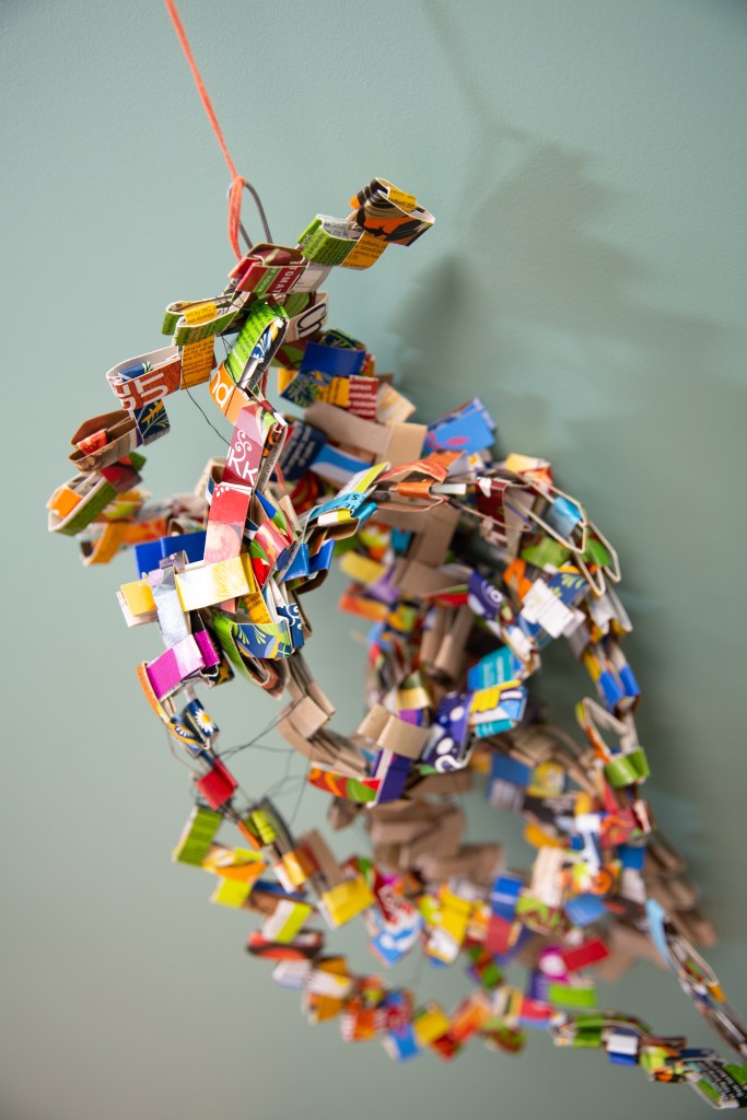 I make 2D and 3D artworks – mostly in reused textiles and cardboard. I’ve been playing with sculptural shapes that combine both very rigid, simple cardboard chain making processes with unruly, somewhat sinister tentacles made with wire and shreds of textiles. They are hairy spidery shapes – sometimes with splashes of pattern and colour. Uneven and misshapen, these cardboard chains are created using obscure weaving techniques that aren’t particularly functional or beautiful. But they do look great en masse and so my challenge is to make enough of any of these shapes for the work to look impactful. I can make about 2 metres of chains per day – not very much really. I use colourful herbal tea packets cut up into strips and then folded into chains. I’ve also been playing with Amazon packaging – their envelopes have just the right level of flexibility and the brown cardboard does somehow evoke something of the rustic straw weaving that’s been my recent inspiration.
