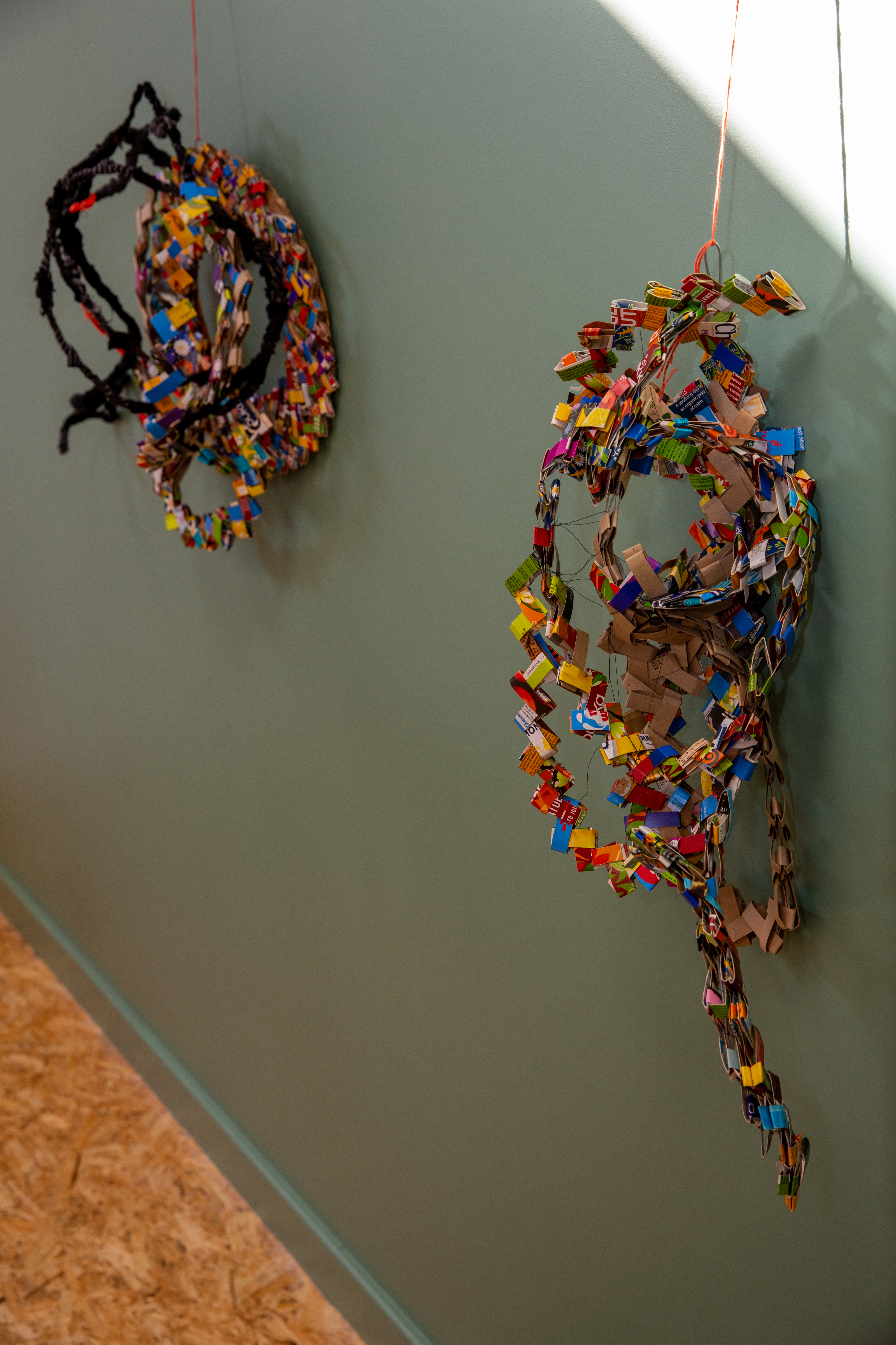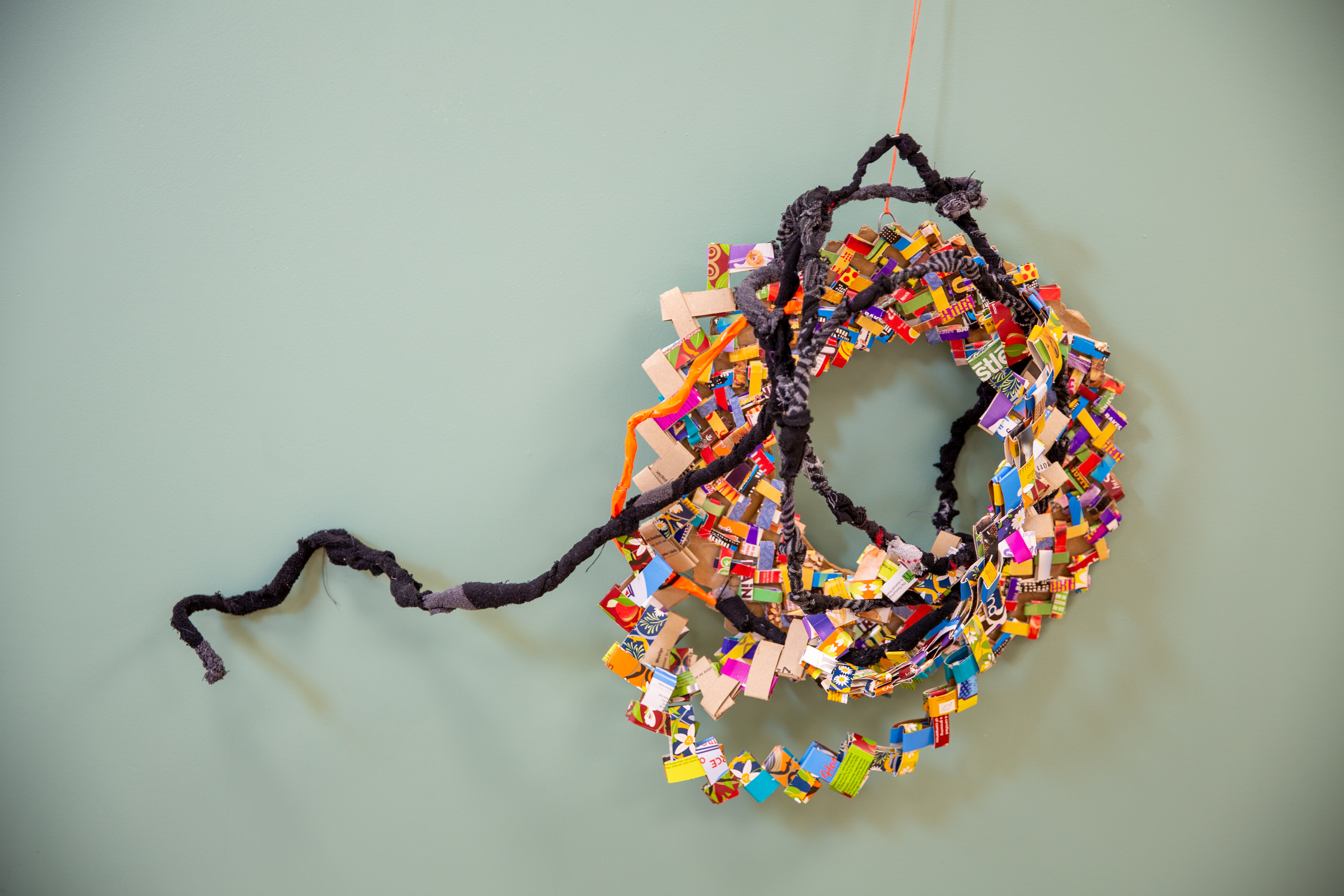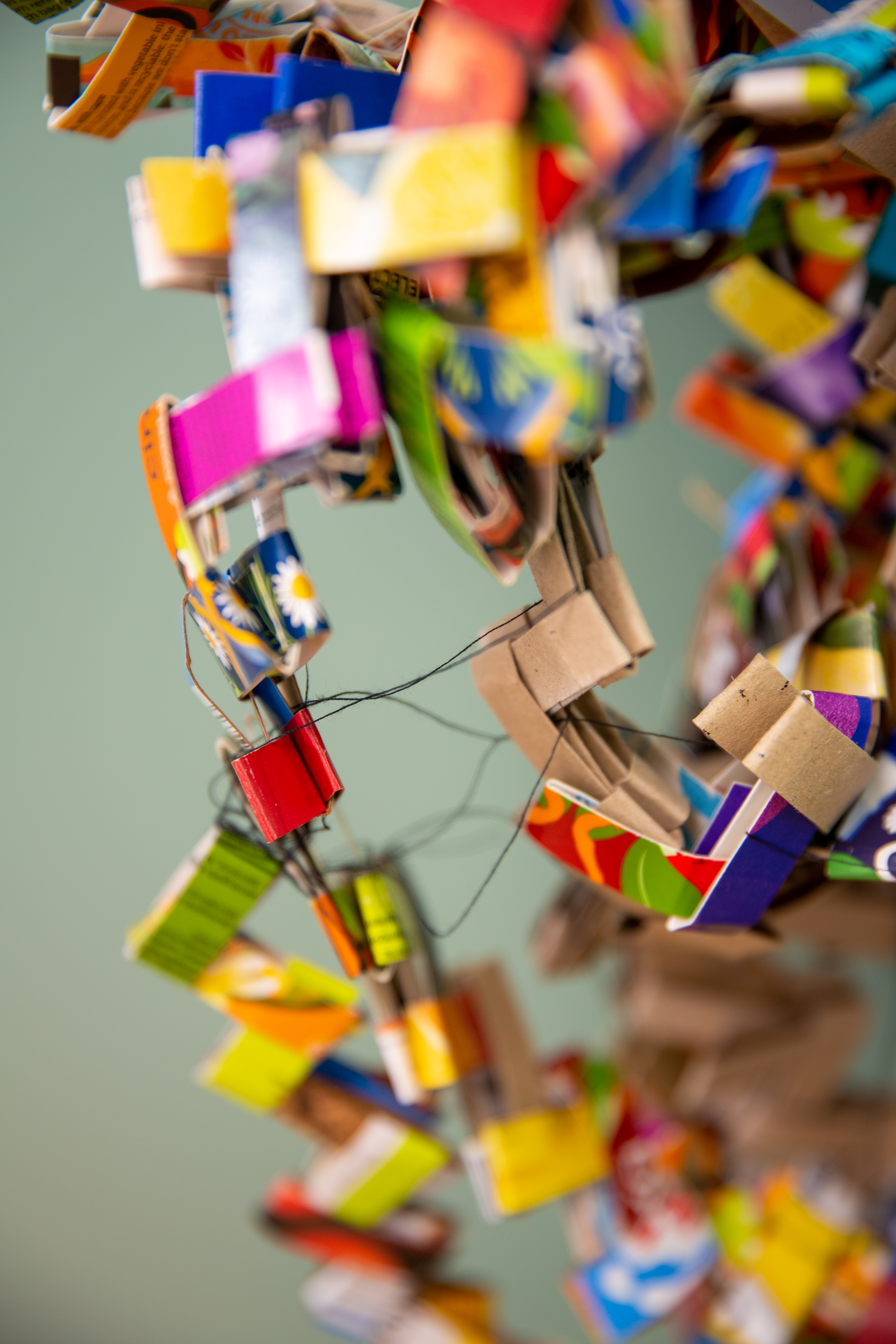 I make 2D and 3D artworks – mostly in reused textiles and cardboard. I’ve been playing with sculptural shapes that combine both very rigid, simple cardboard chain making processes with unruly, somewhat sinister tentacles made with wire and shreds of textiles. They are hairy spidery shapes – sometimes with splashes of pattern and colour. Uneven and misshapen, these cardboard chains are created using obscure weaving techniques that aren’t particularly functional or beautiful. But they do look great en masse and so my challenge is to make enough of any of these shapes for the work to look impactful. I can make about 2 metres of chains per day – not very much really. I use colourful herbal tea packets cut up into strips and then folded into chains. I’ve also been playing with Amazon packaging – their envelopes have just the right level of flexibility and the brown cardboard does somehow evoke something of the rustic straw weaving that’s been my recent inspiration.
