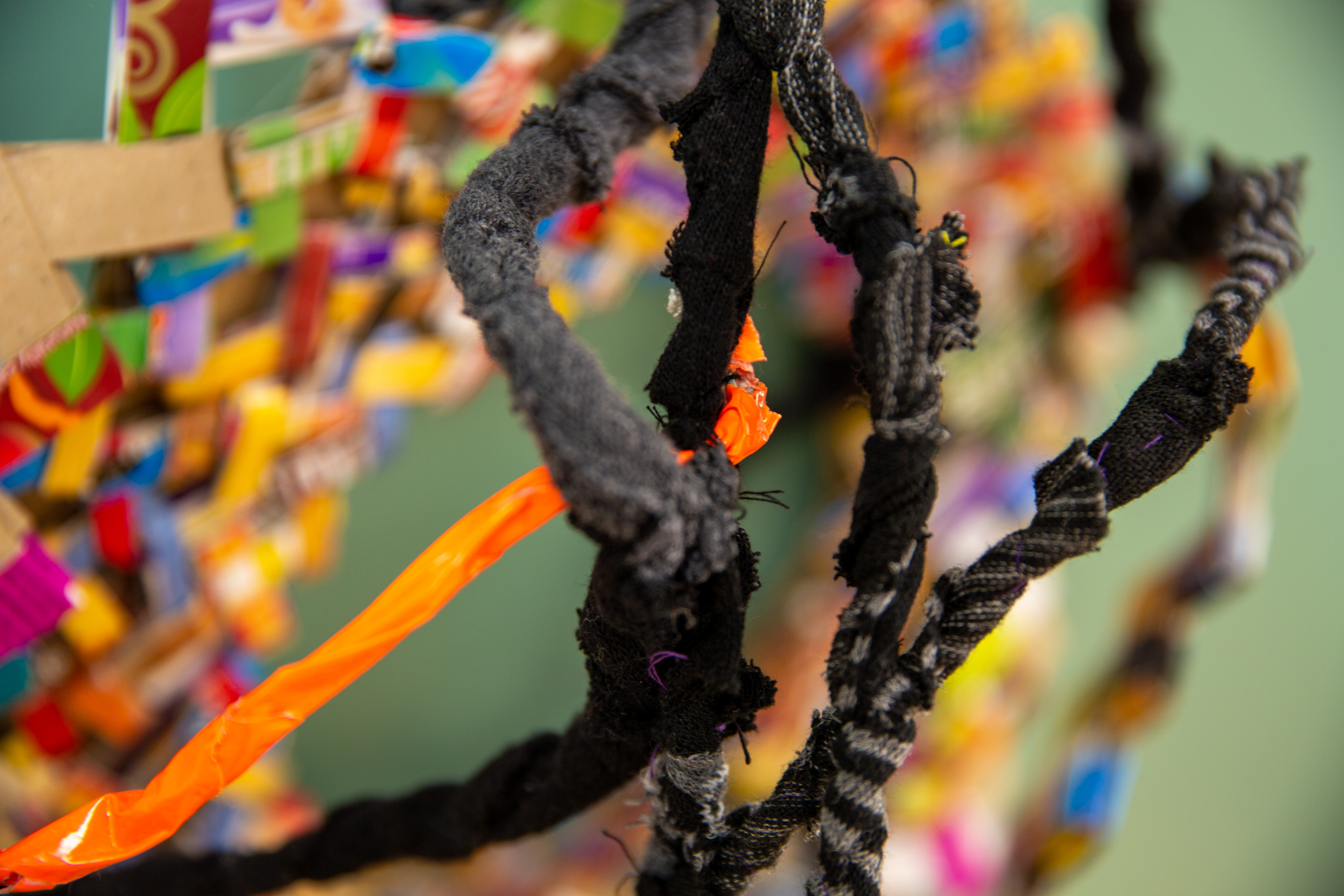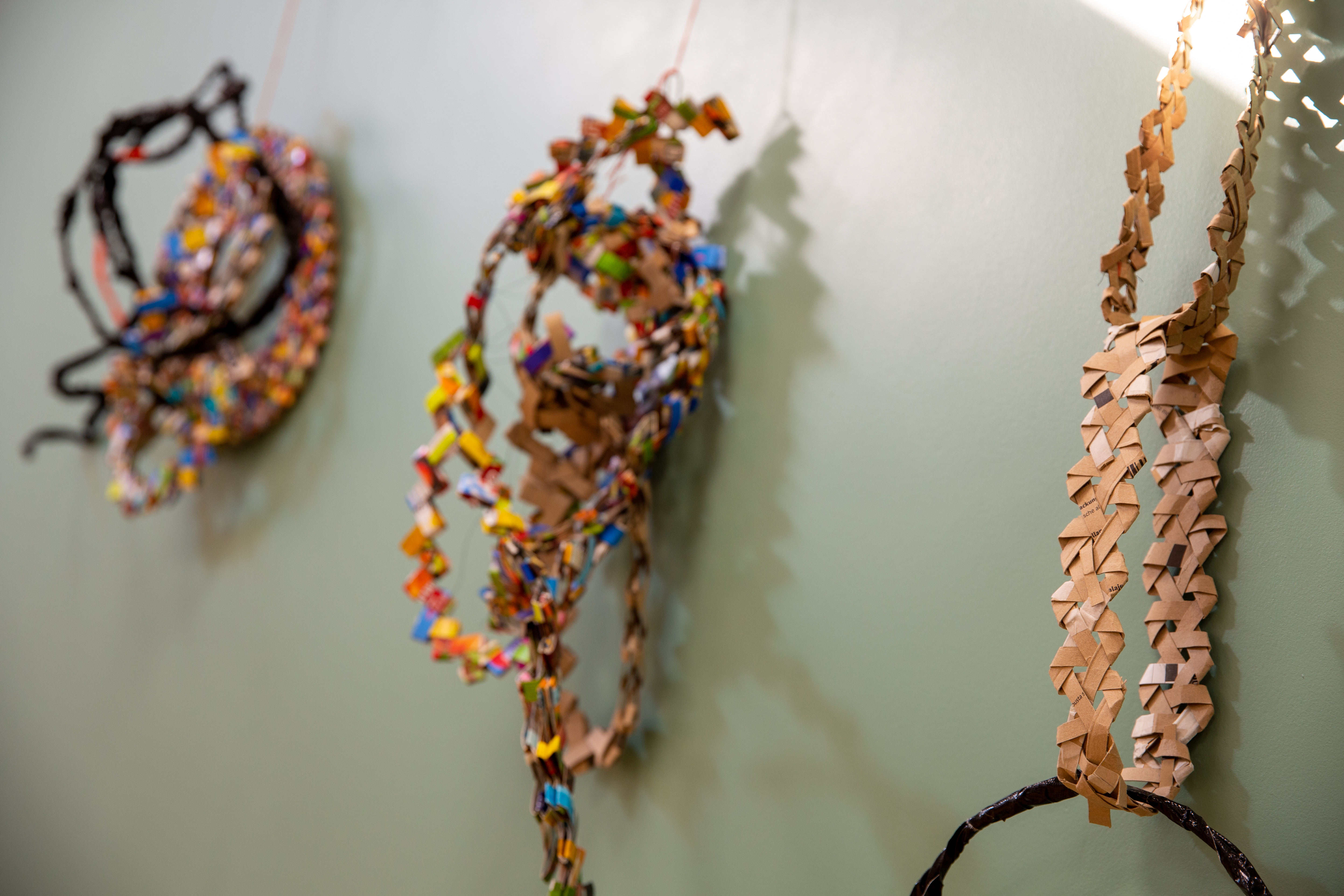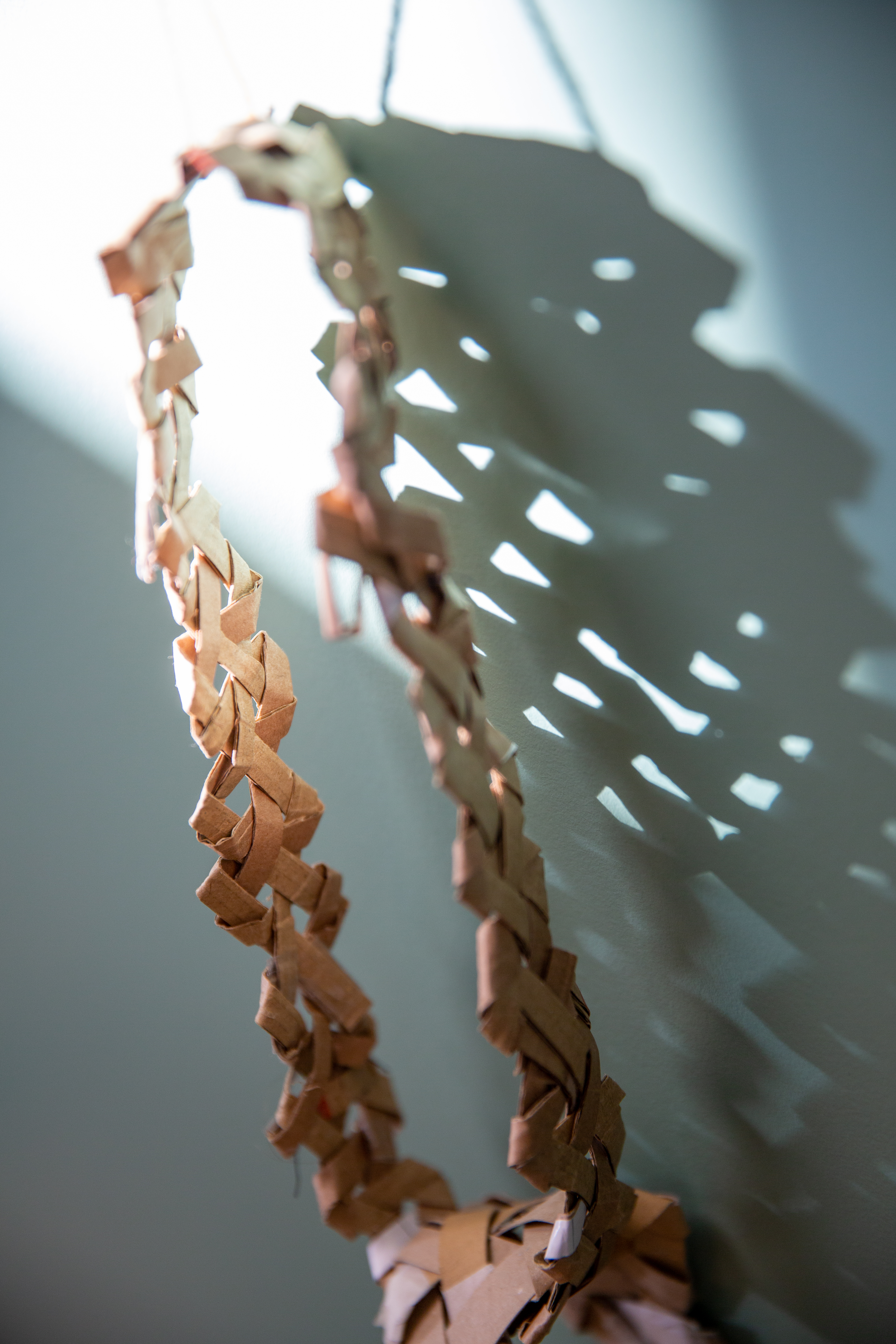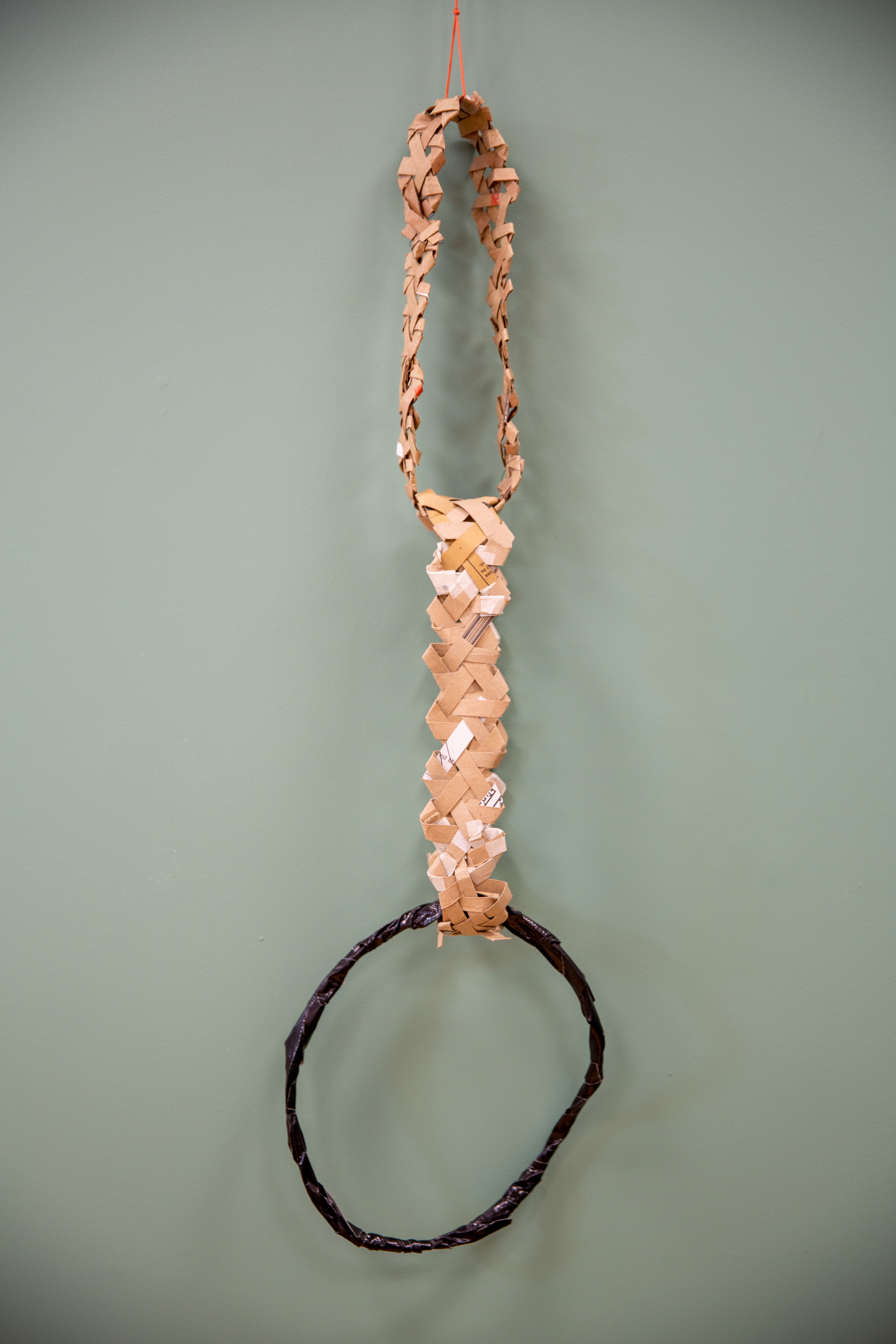 I make 2D and 3D artworks – mostly in reused textiles and cardboard. I’ve been playing with sculptural shapes that combine both very rigid, simple cardboard chain making processes with unruly, somewhat sinister tentacles made with wire and shreds of textiles. They are hairy spidery shapes – sometimes with splashes of pattern and colour. Uneven and misshapen, these cardboard chains are created using obscure weaving techniques that aren’t particularly functional or beautiful. But they do look great en masse and so my challenge is to make enough of any of these shapes for the work to look impactful. I can make about 2 metres of chains per day – not very much really. I use colourful herbal tea packets cut up into strips and then folded into chains. I’ve also been playing with Amazon packaging – their envelopes have just the right level of flexibility and the brown cardboard does somehow evoke something of the rustic straw weaving that’s been my recent inspiration.