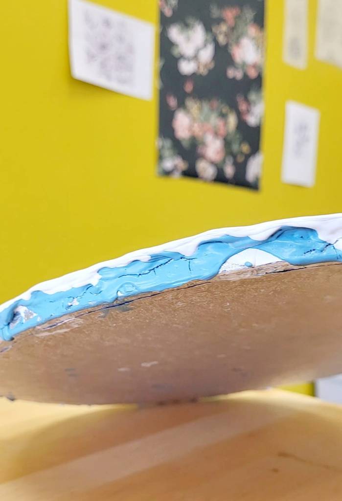 I’m often left with old display cake boards, and I thought this would be a great way to upcycle them. I’m naturally a neat and tidy artist so it took a while for me to appreciate the natural drips over the edge of the board. I had to fight the urge to wipe my workspace clean every 15 minutes. I enjoyed watching the layers of paint build and the daily ritual of painting but hadn’t scheduled the time to draw a design and scratch the surface until now.