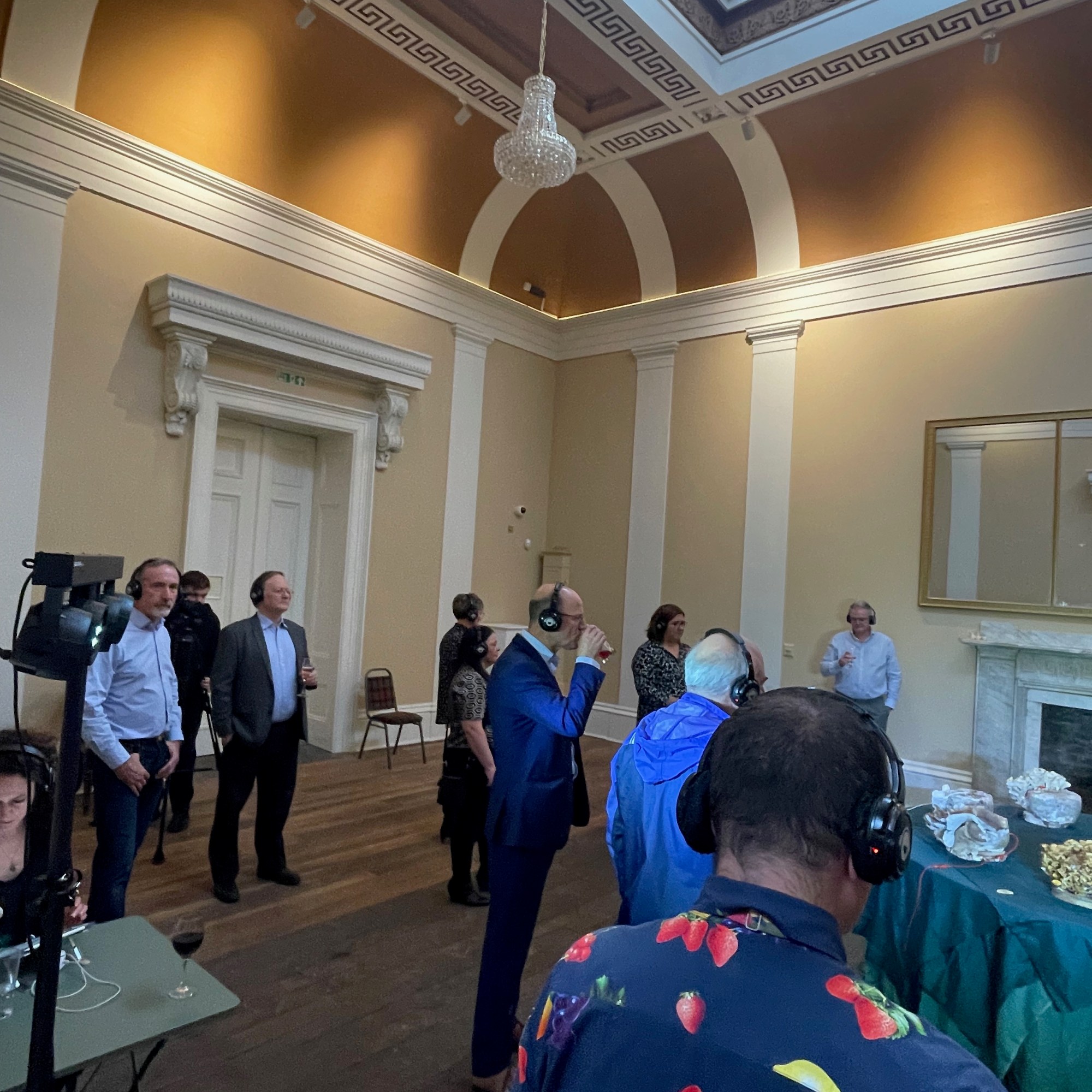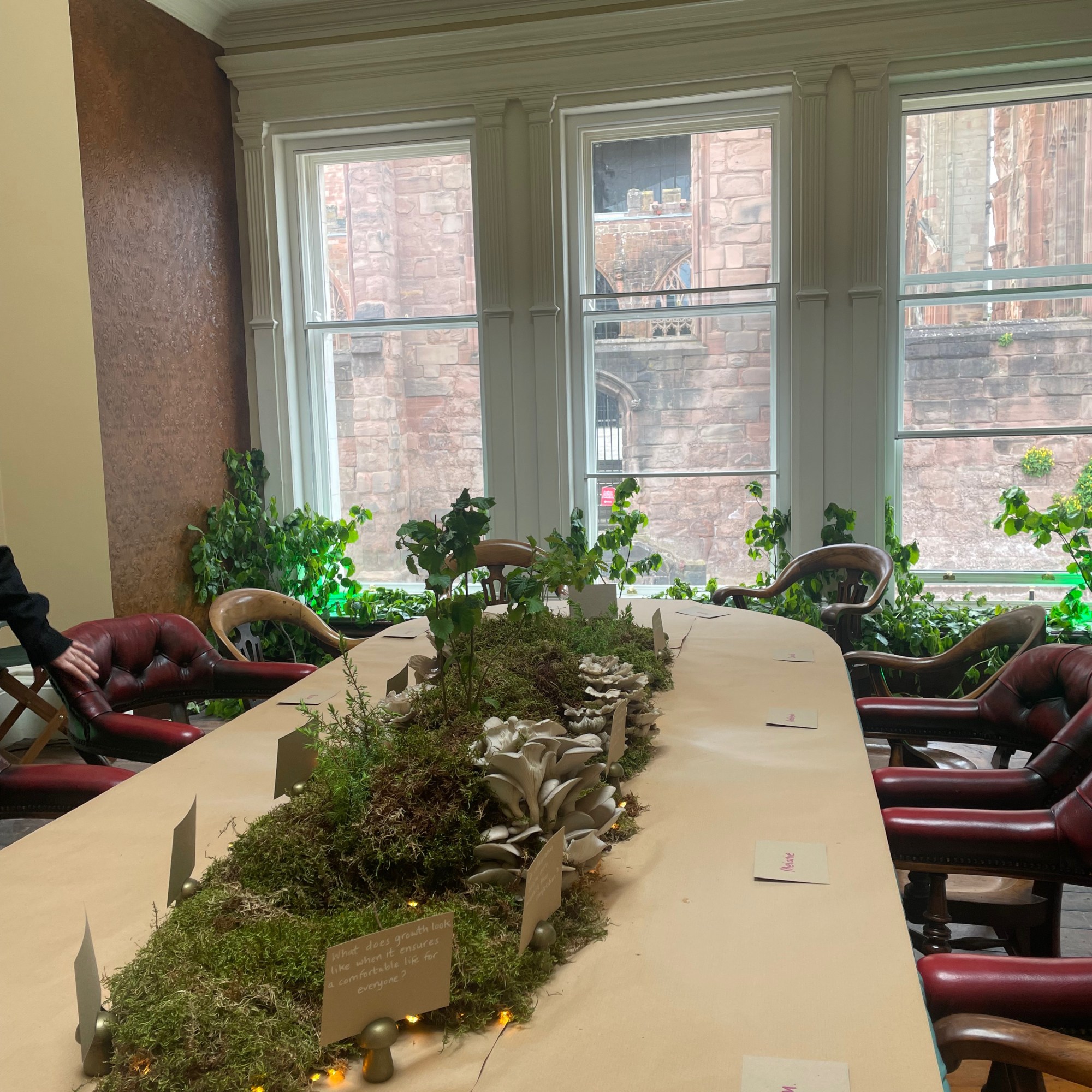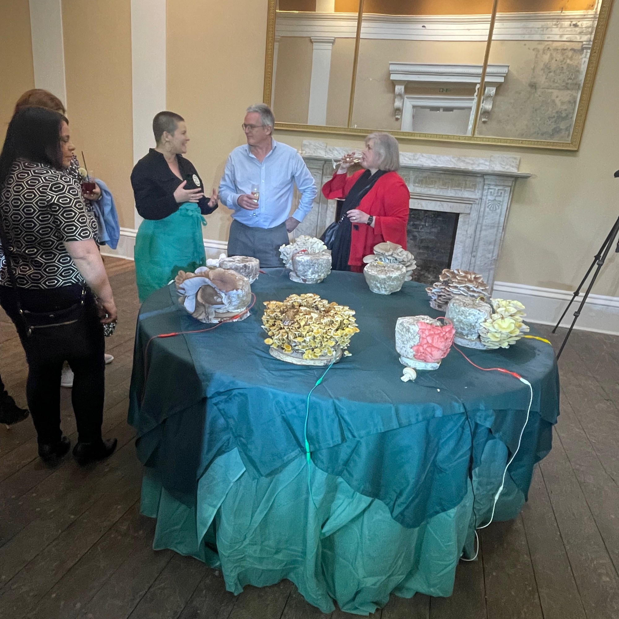 To prepare for the evening, Janet had conceived the idea of mycelium as something that could be materially present in the space as well as a way of thinking critically about sustainability. She engaged the mycelium (mushroom) artist Lisa Franklin to install an interactive experience in one of the rooms at Drapers’ Hall and provide mushrooms to integrate into the dinner table decorations. Freelance actor Joshua Patel came on board to function as Master of Ceremonies and illustration artist Camille Aubry from Bristol was commissioned to provide a real time recording of the evening. Comprehensive film and audio documentation of the evening was organised by Spencer James of Fresh, a Coventry based media team. The eleven guests arrived on time and the drinking, eating and conversing began. In the first room, they enjoyed the canapes and drinks, engaged in creating sound together with the interactive mushroom installation and listened together to “The Accountant” – a talking audio piece conceived by Talking Birds, set within a post-covid world, that imagines the accountant’s role beyond financial measurement and quantification. The guests then entered the dining room.
