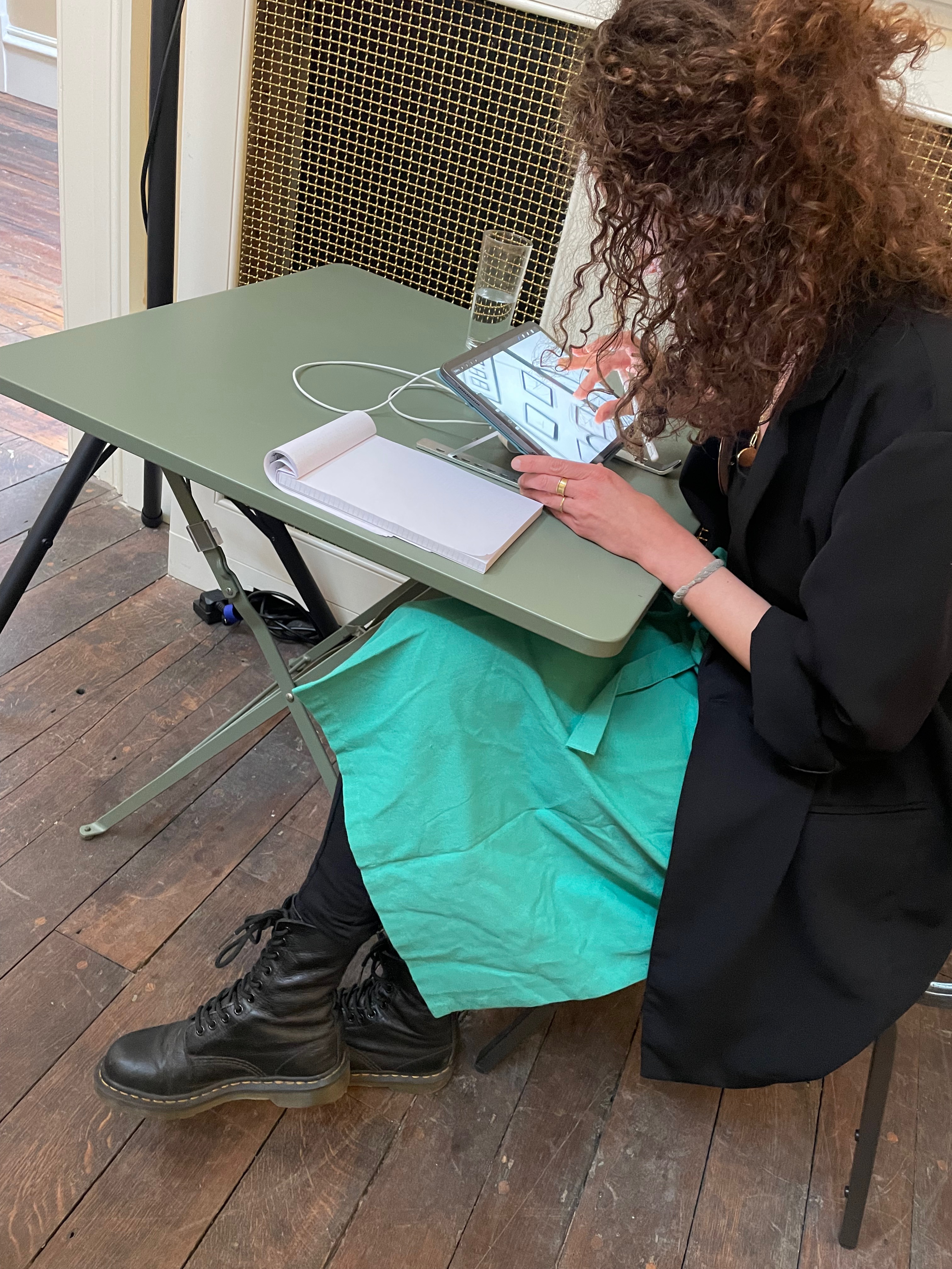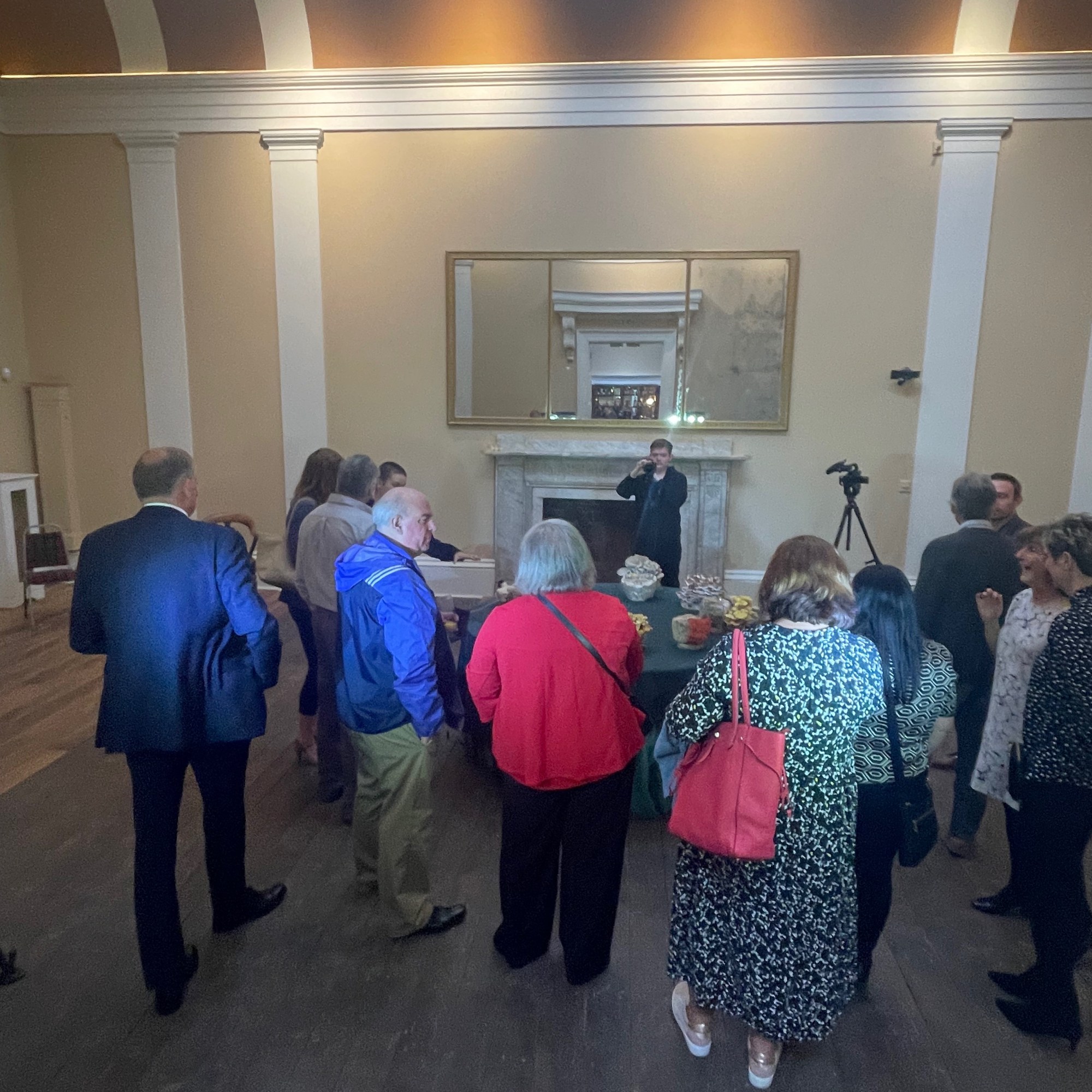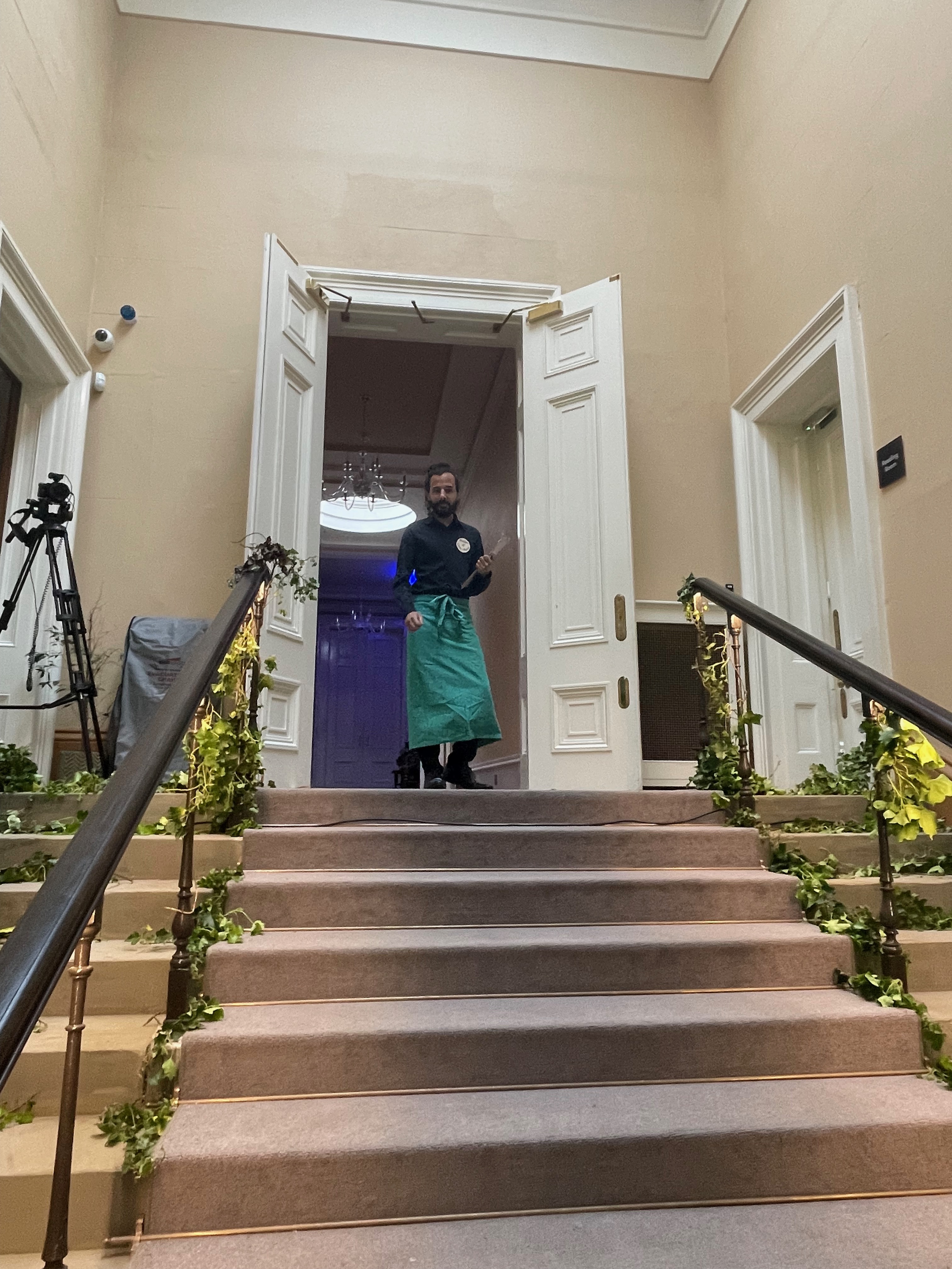 To prepare for the evening, Janet had conceived the idea of mycelium as something that could be materially present in the space as well as a way of thinking critically about sustainability. She engaged the mycelium (mushroom) artist Lisa Franklin to install an interactive experience in one of the rooms at Drapers’ Hall and provide mushrooms to integrate into the dinner table decorations. Freelance actor Joshua Patel came on board to function as Master of Ceremonies and illustration artist Camille Aubry from Bristol was commissioned to provide a real time recording of the evening. Comprehensive film and audio documentation of the evening was organised by Spencer James of Fresh, a Coventry based media team. The eleven guests arrived on time and the drinking, eating and conversing began. In the first room, they enjoyed the canapes and drinks, engaged in creating sound together with the interactive mushroom installation and listened together to “The Accountant” – a talking audio piece conceived by Talking Birds, set within a post-covid world, that imagines the accountant’s role beyond financial measurement and quantification. The guests then entered the dining room.
