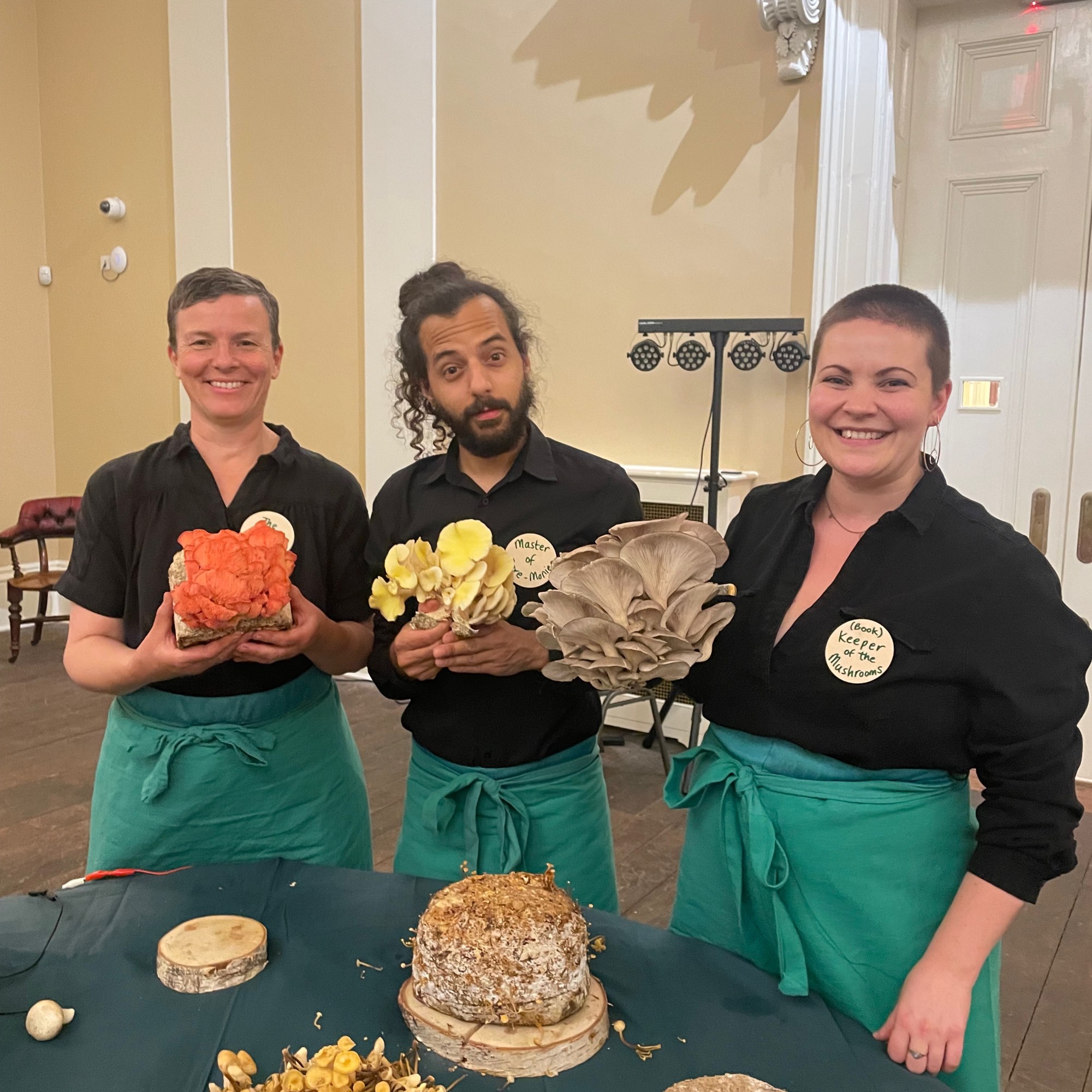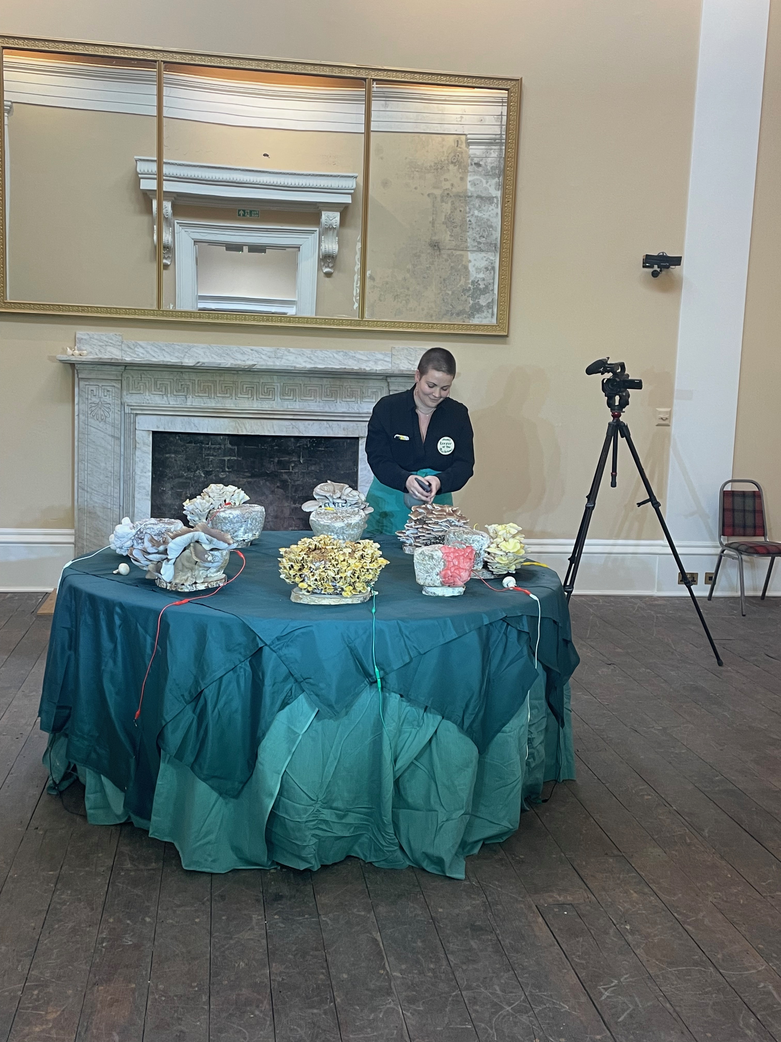 [Top row L-R: The entrance to Drapers’ Hall; The table setting with mushrooms, name tags and questions; Guests exploring the interactive sonic mushroom installation. Middle row L-R: Guests exploring the interactive sonic mushroom installation; Guests experiencing the audio piece ‘The Accountant’; Fresh Media documentation centre. Bottom row L-R: Table setting with mushrooms, moss and prompt questions; The table setting after the event with questions recorded on the table cloth; Janet, Josh and Lisa, Talking Birds. Photo Credits: Alessandro Merendino]