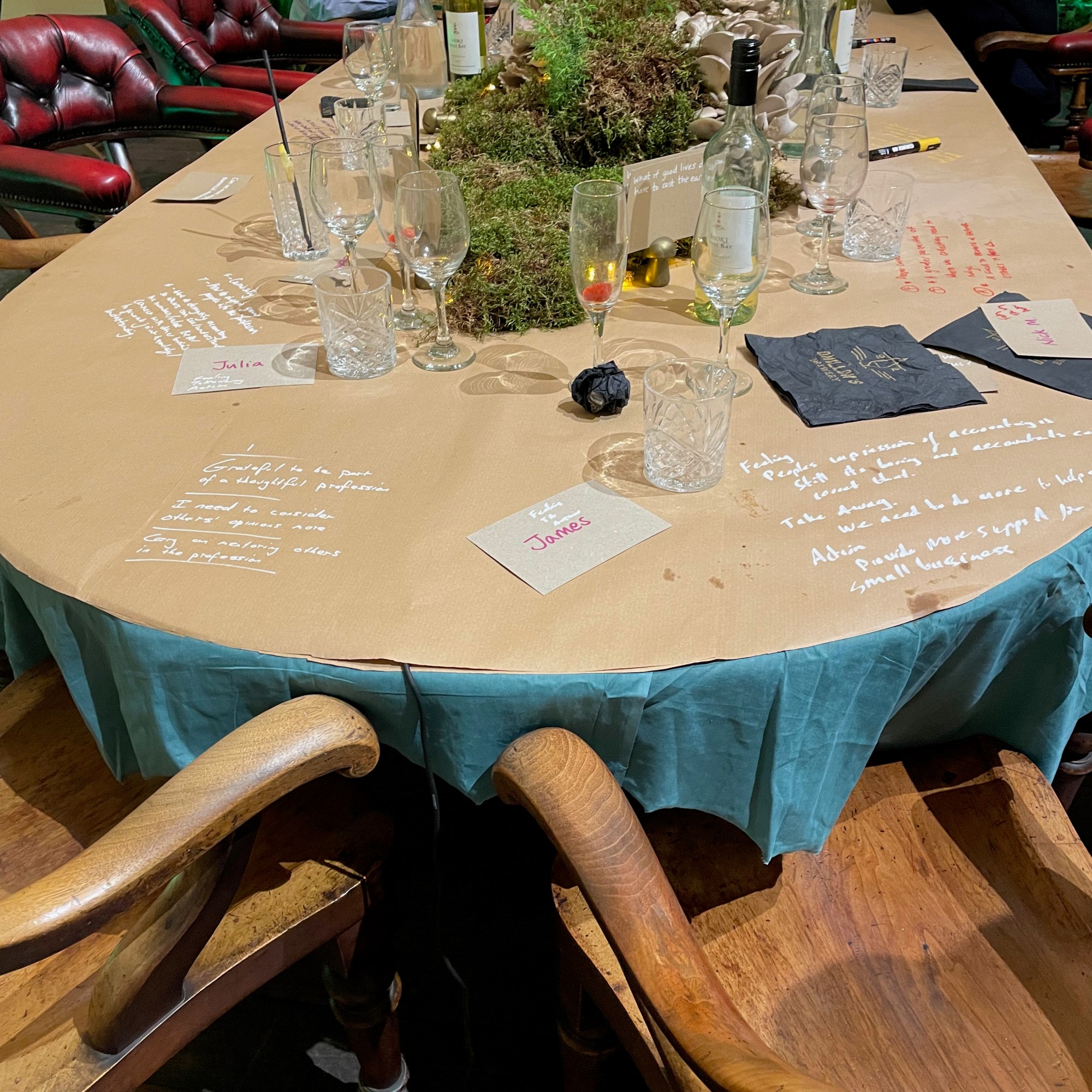 Arranged around the table were questions as prompts, but as they began their three-course meal, the guests did not need much prompting to begin discussing a range of issues and concerns. As experts speaking to other experts in their field, they spoke openly and candidly about different aspects of the profession that concerned them with the key topics (sustainability and digital) threading through these. Nick McGuigan joined the dinner table, while the other researchers remained in the observation room which had been set up by Spencer’s Fresh team. Don’t worry! Ethical approvals had been obtained from all the guests. As everyone warmed to each other and the discussion the time rushed by and, in the end, the two hours scheduled for the evening seemed far too short! On their way out, all were invited to leave comments in writing on the tablecloth, and a few short video interviews captured participant engagement.