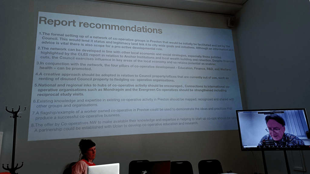 The first presentation comes from Julian Manley (University of Central Lancashire), entitled “The Preston Model: Growth without Growth”. The “Preston Model”, as it has been dubbed, is an economic development model centred in an ethos of “community wealth-building”. Manley details how, in the wake of the abandonment of the £700m Tithebarn regeneration project in 2011, Preston City Council commissioned a research report, “What is the potential for developing co-operation in Preston?” (drawing significantly from the example of Mondragon in the Basque Country), resulting in 8 key recommendations to be taken forward.
