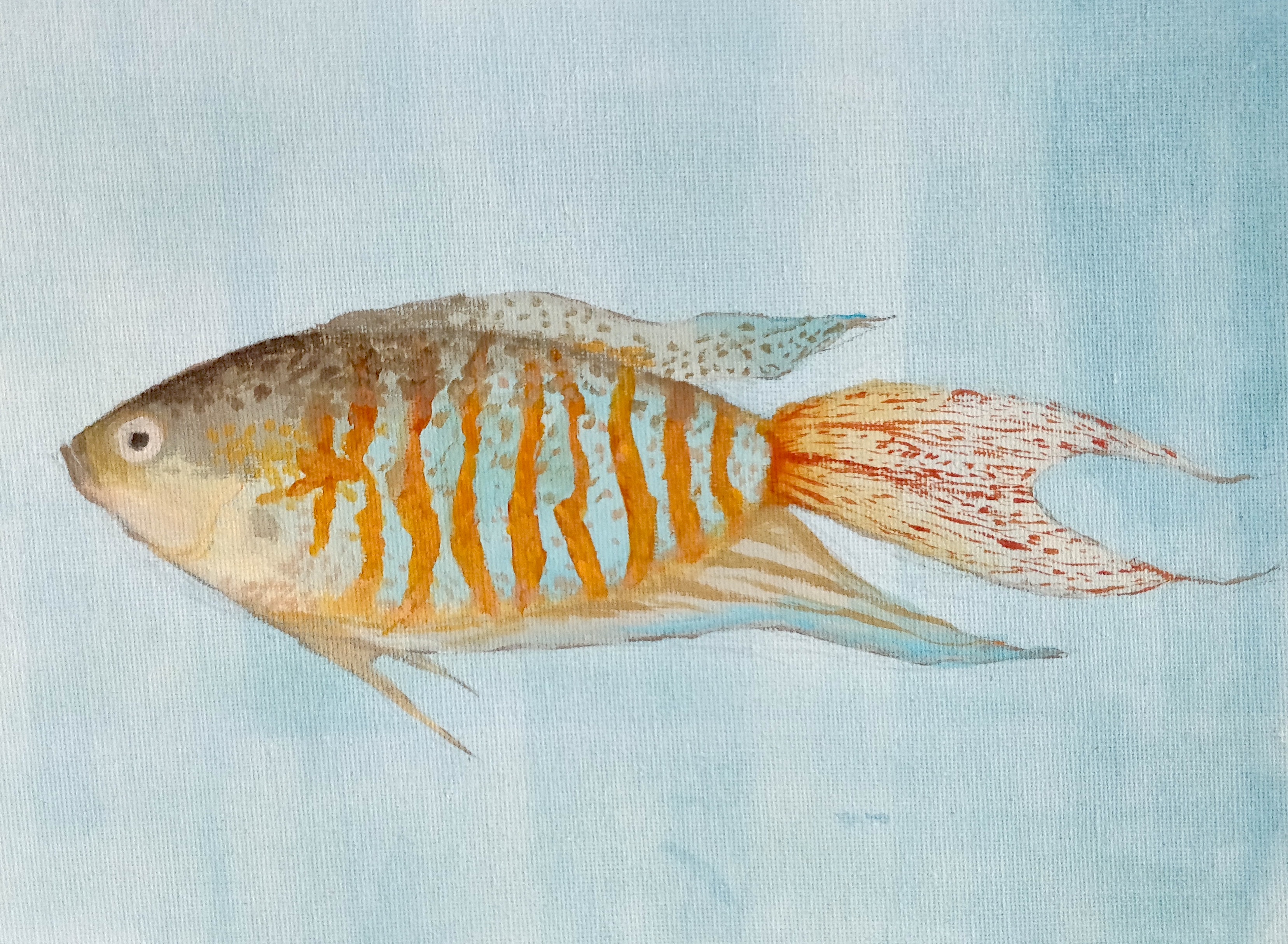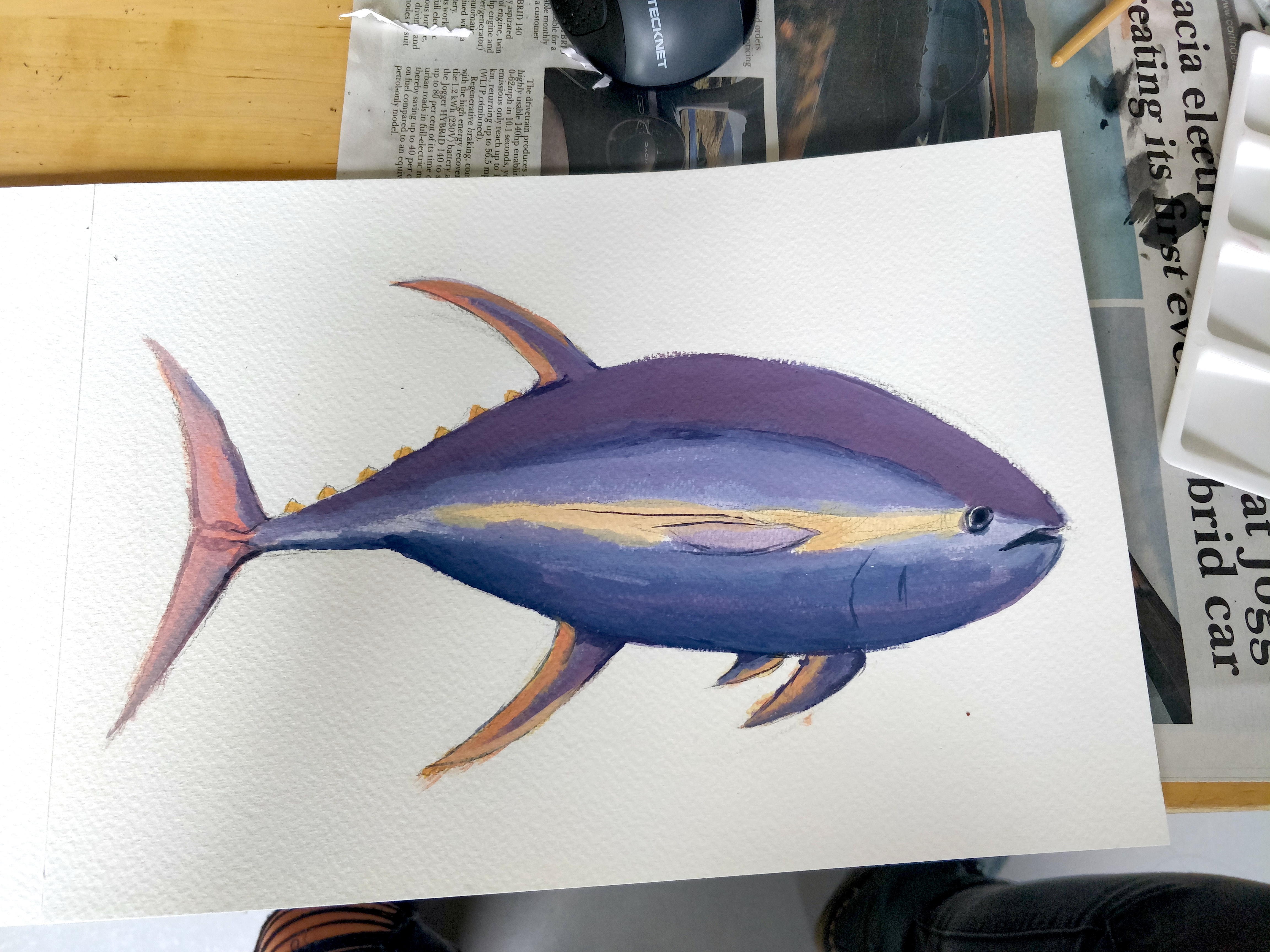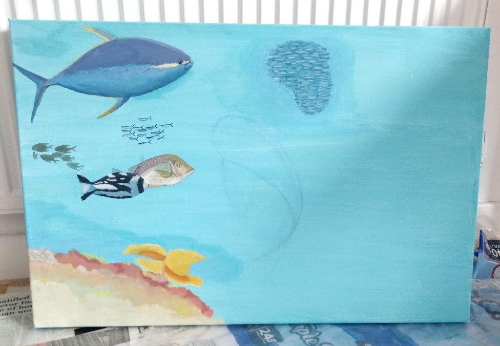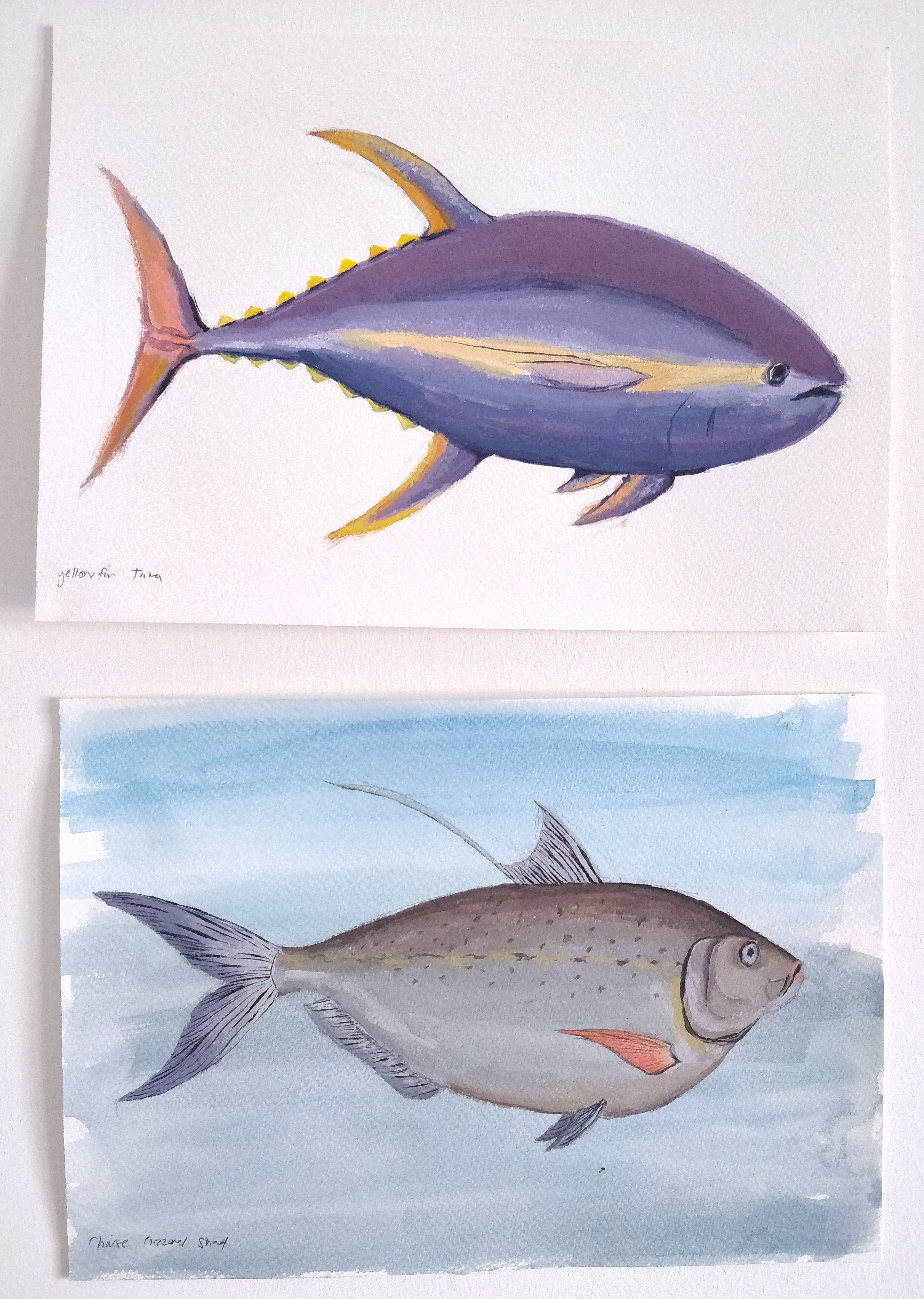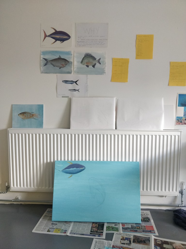 As an artist, for my residency my project focussed heavily on exploring and experimenting with ways I could reflect and display my own identity and internal struggles through the world of fish and marine life. An aspect I wanted to include was my cultural heritage; with the use of fish surrounding Taiwan included in my artwork, art styles and choosing fish that symbolized particular meanings. Many of the fish I wanted to paint were heavily inspired by hierarchies and societal roles in everyday life. I worked primarily in paints and inks related to traditional artworks such as gouache and calligraphy ink and spent the full ten days at the nest, popping in and out over the course of two months.