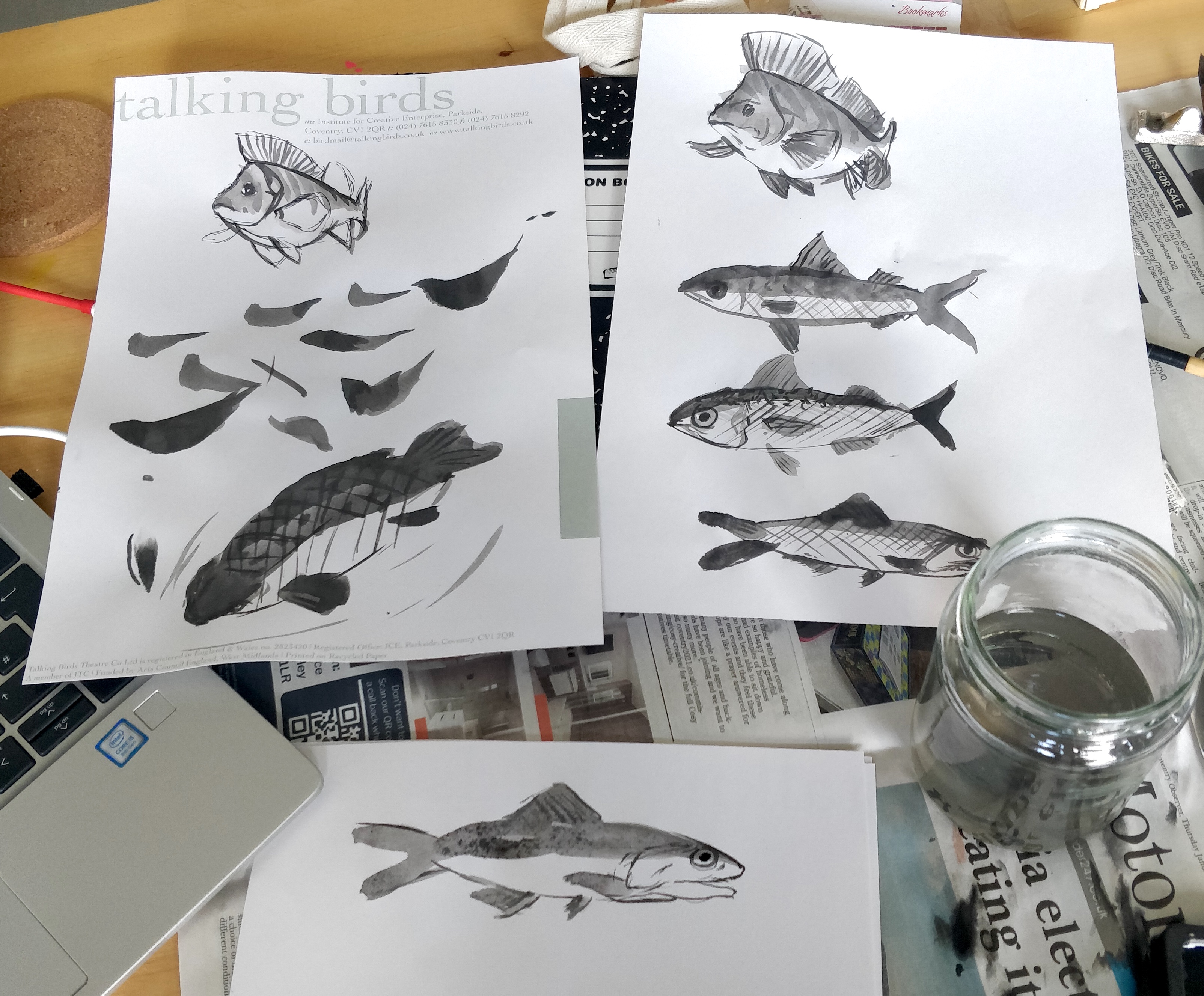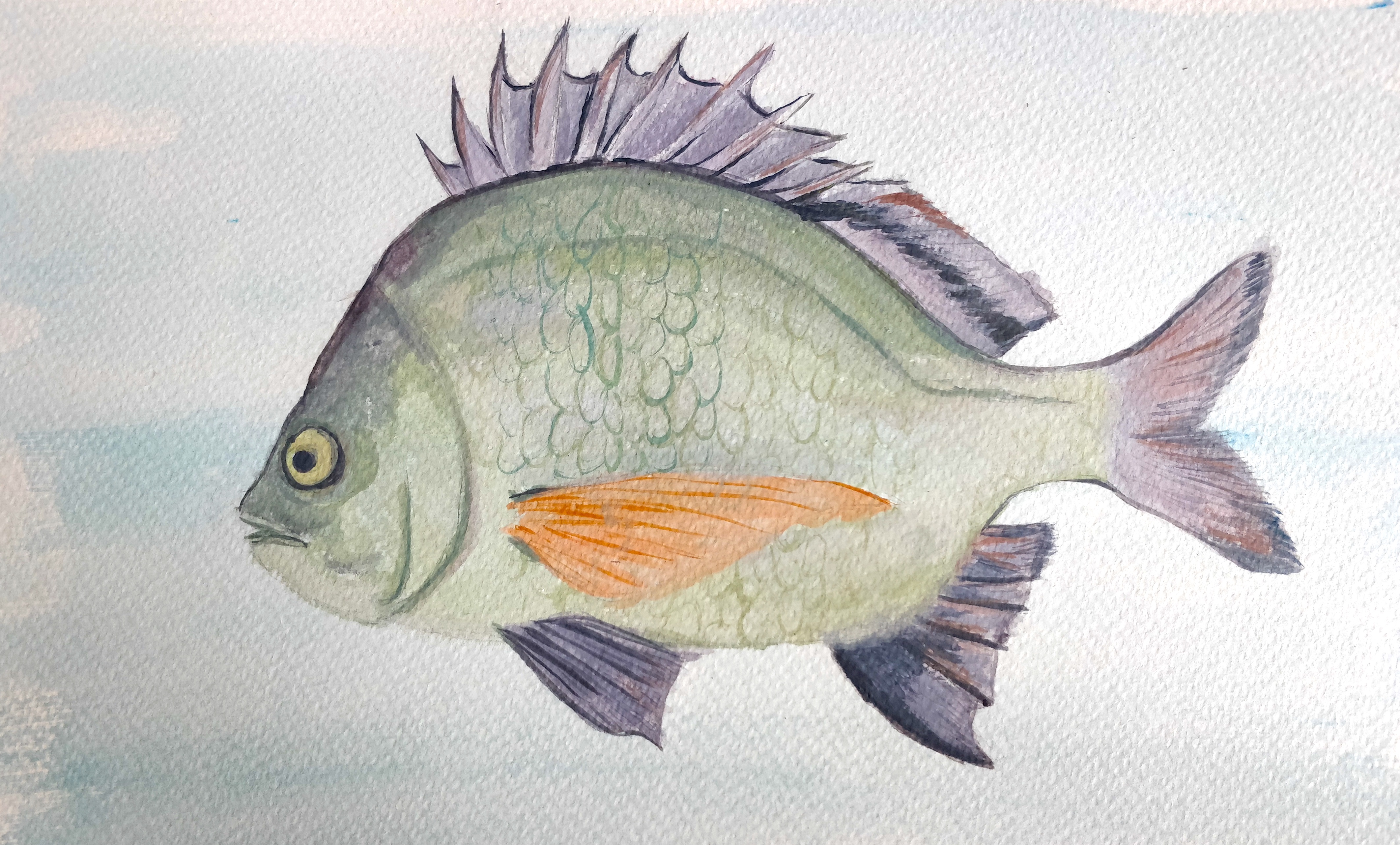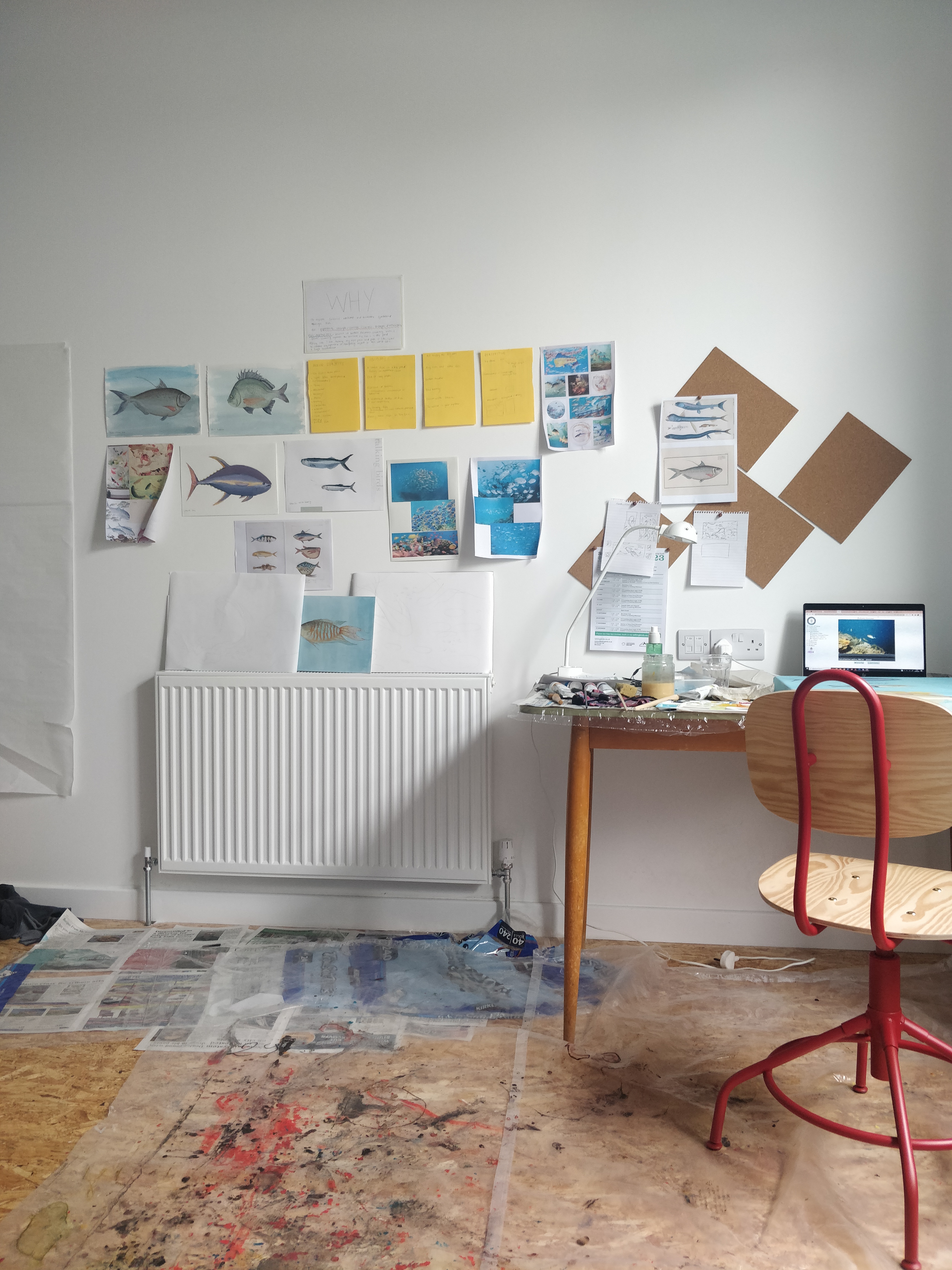 As an artist, for my residency my project focussed heavily on exploring and experimenting with ways I could reflect and display my own identity and internal struggles through the world of fish and marine life. An aspect I wanted to include was my cultural heritage; with the use of fish surrounding Taiwan included in my artwork, art styles and choosing fish that symbolized particular meanings. Many of the fish I wanted to paint were heavily inspired by hierarchies and societal roles in everyday life. I worked primarily in paints and inks related to traditional artworks such as gouache and calligraphy ink and spent the full ten days at the nest, popping in and out over the course of two months.