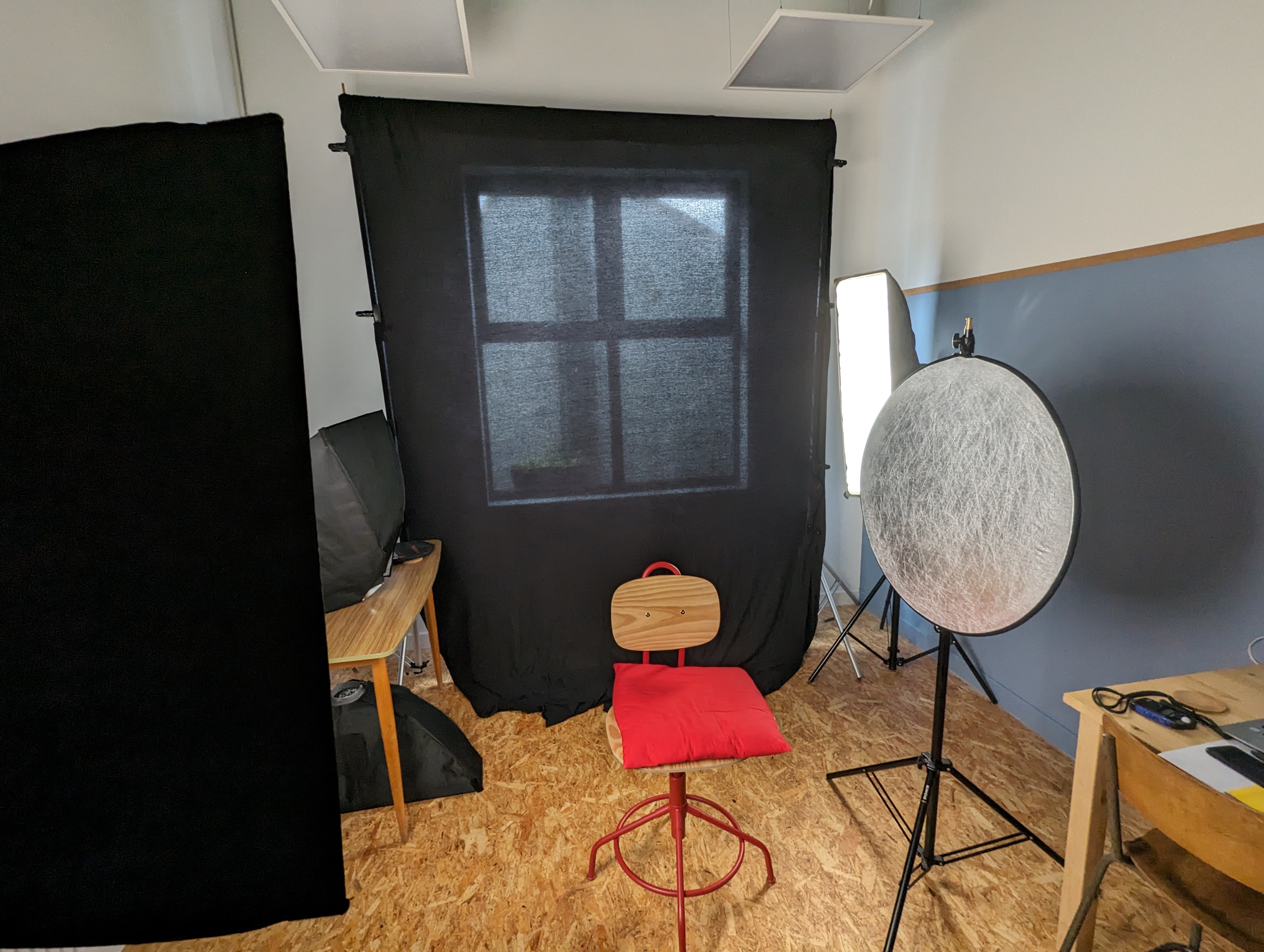 I set up my photographic studio at the Nest and started to take test shots, test the light of the room and the setting of the equipment required. It is important to understand the environment in which the photographs are to be taken so to be able to capture the portraits efficiently, so that the participants do not have to wait long before and during the shoots. I have selected a black backdrop to help better defined colours and shapes; this will also provide the effect of light coming from the darkness.
