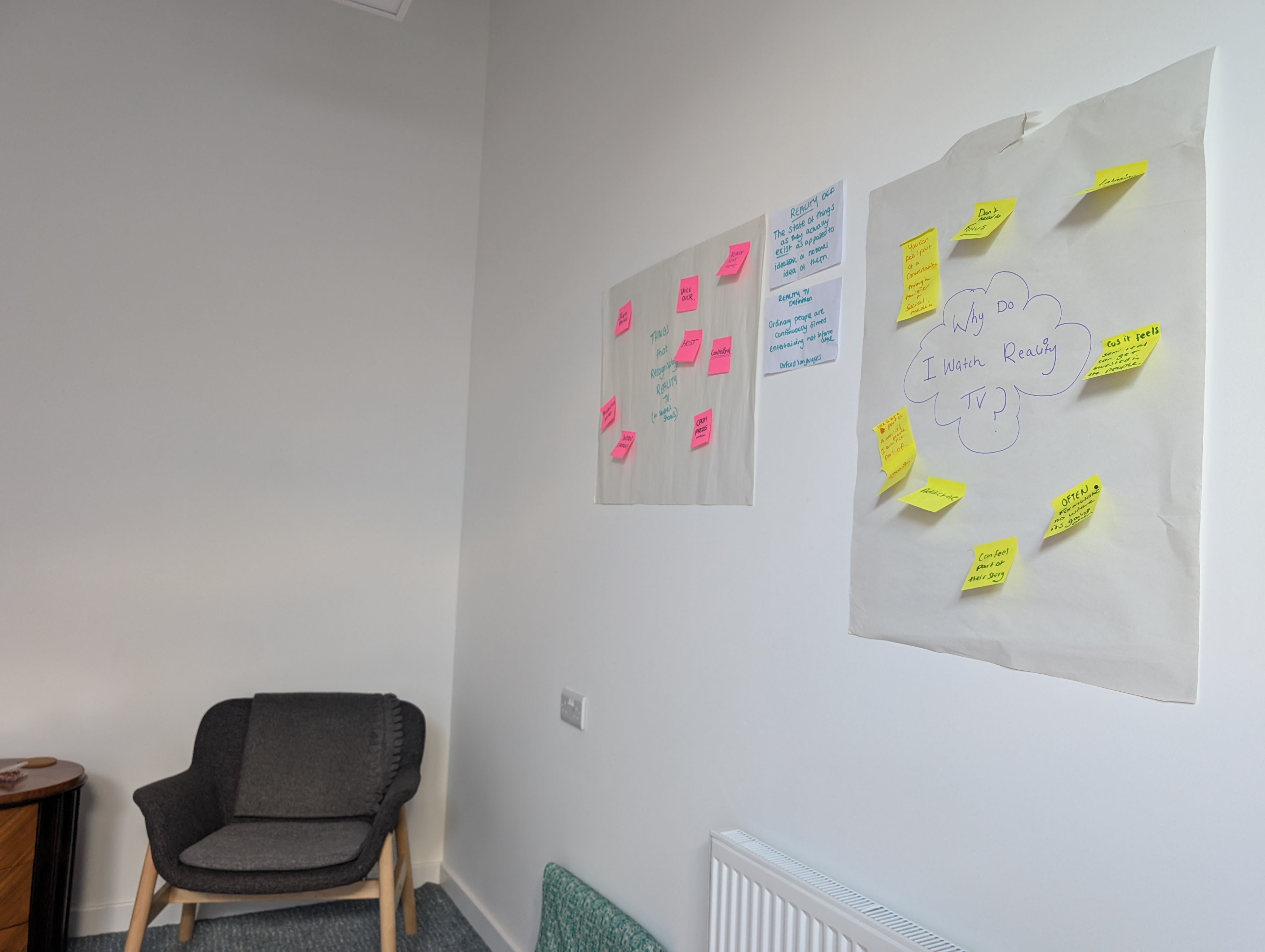 I purposely had set no expectations for what the week would be apart from my proposal. Hopefully ideas and thinking would move forward, or pivot or change. I wanted to keep this free of any typical influences to see if it would inspire me to work differently, however there was one similarity. I had brought what feels like a staple for me, flipchart paper and sticky notes, and started to categorise different reality TV shows into genres. I then started filling notes with thoughts about why I watch so much reality TV, what hooks me, what keeps me watching a new series.
