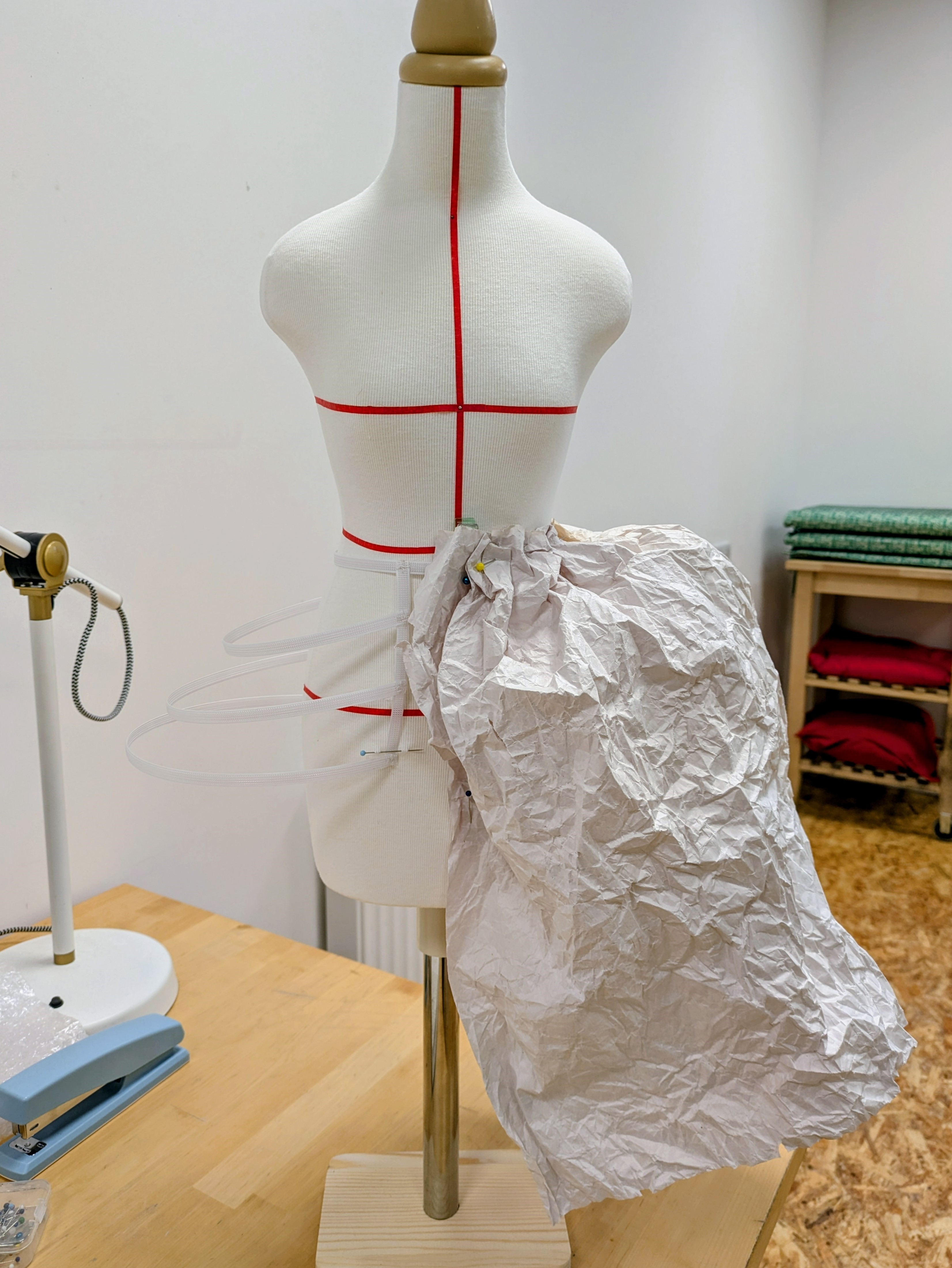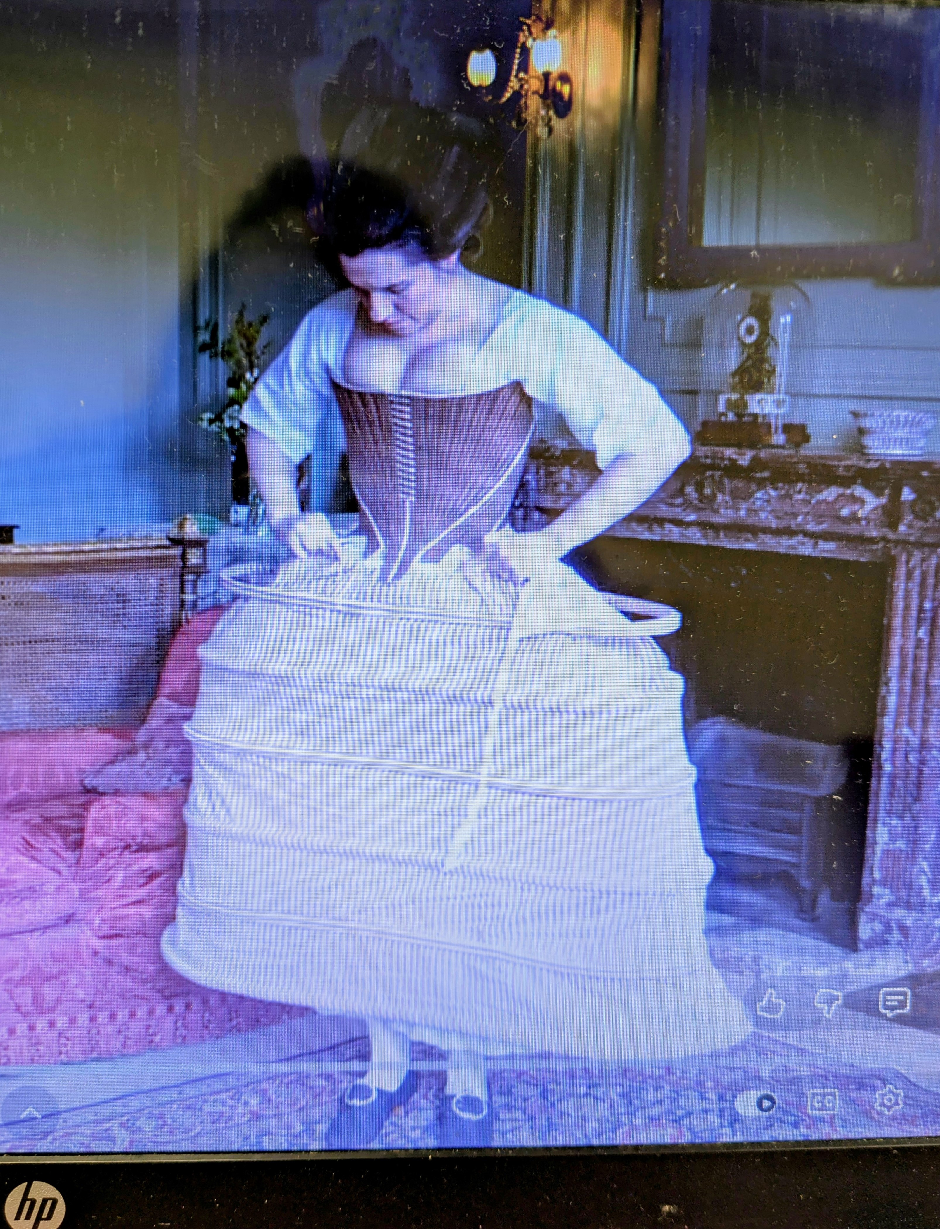 The issue of making enough space for the action to take place was solved by looking at 18th century costume. I knew about hooped skirts and during my internet scrolling and video watching I discovered Paniers or flat hoops that stick out from the hips creating a wide, flat front to skirts and plenty of space to place curtains, stage and characters.