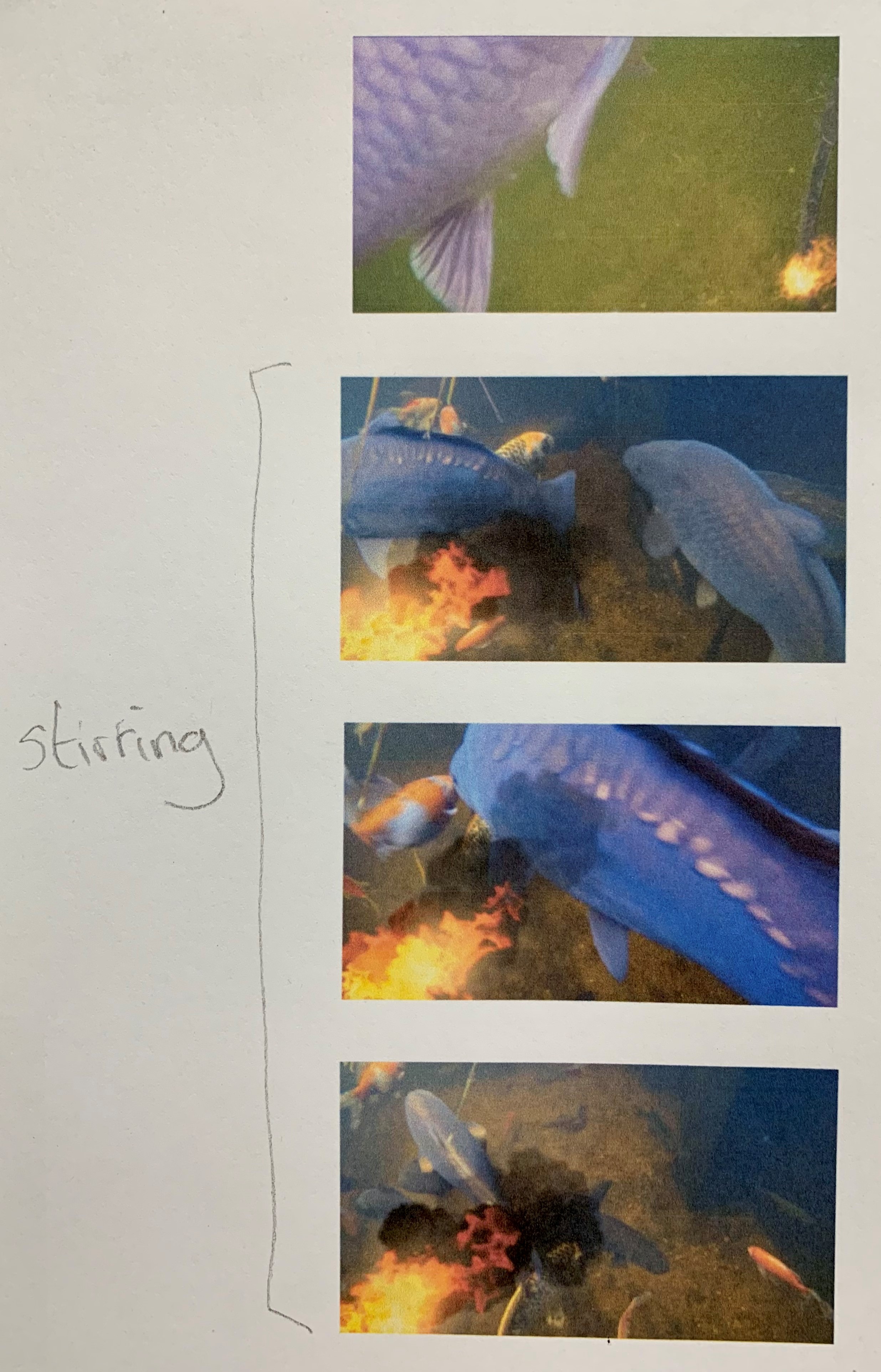 There’s objects in the water that look like coconuts. I think of when offerings are given to the river Ganges, to show gratitude for sustaining life. I start remembering my grandma and the ritual when we immersed her ashes in Stratford upon Avon, because the river Avon eventually reaches the sea, just like the Ganges.